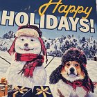 A cheerful corgi wearing a Santa hat sits beside a snowman in a snowy landscape adorned with trees and colorful presents, capturing the festive spirit of winter.