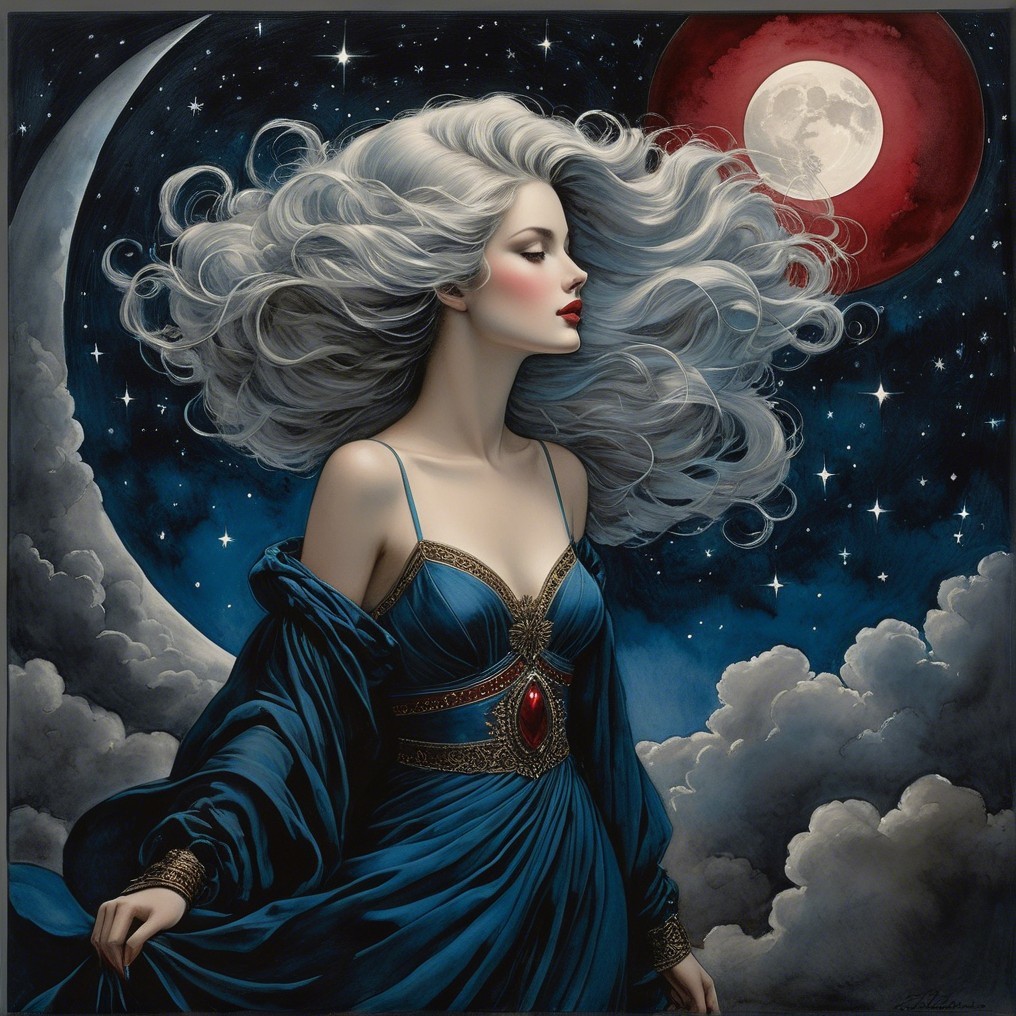 A mystical woman with flowing silver hair stands against a dark, starry sky. She wears a deep blue gown, highlighted by a red moon that casts an enchanting glow around her.