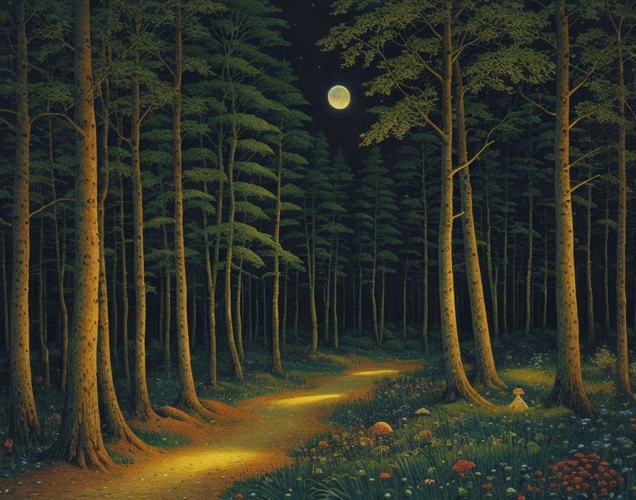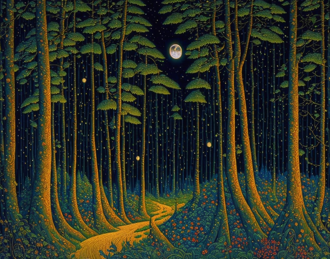 A stylized forest with a starry night sky, glowing moon, dotted with golden lights and a path leading through it.