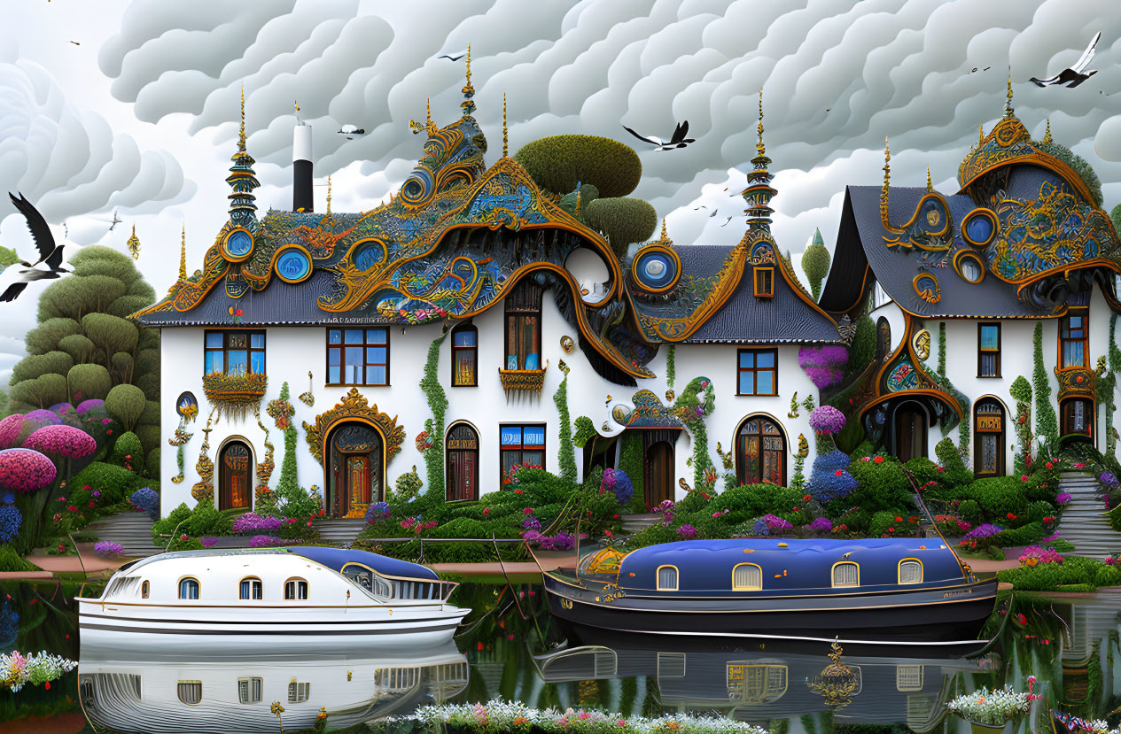 Prompt: Black and White landscape, fantastical surrealist otherworldly, vivid colours, ornate, intricate, elegant, surreal, stormy clouds, beautiful high definition acrylic art intricate details, Artist Jacek Yerka, Richard Dennis, ''Beautiful clouds!!!'' Artwork by Salvador Dali, Joe Fenton, Andree Wallin, Ismail Inceoglu, Wassily Kandinsky, Katsushika Hokusai, artstation, 8K octane render