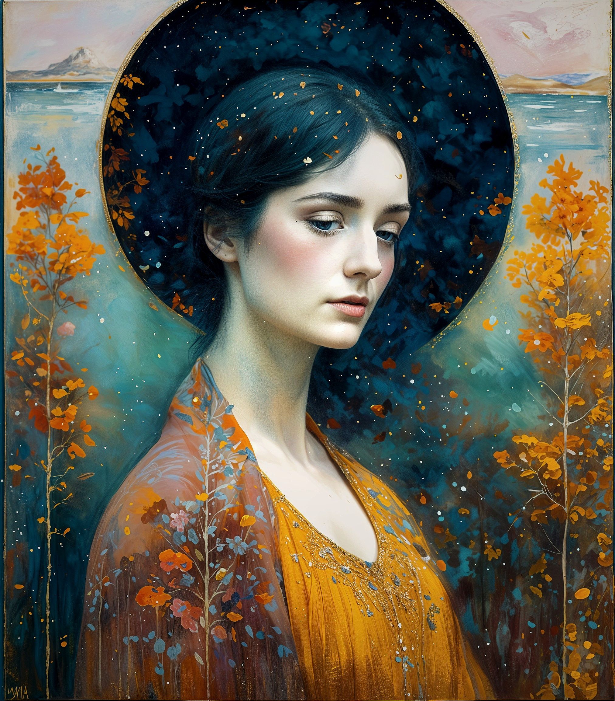 The artwork features a serene young woman adorned in a vibrant orange gown, surrounded by autumnal foliage. A dark halo-like background enhances her contemplative expression.