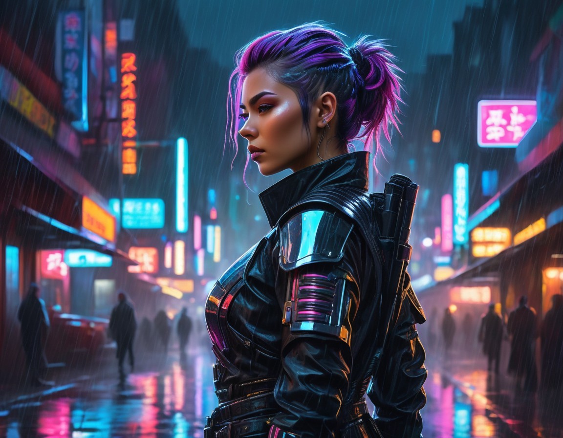 Her armor glinting back at the reflected city lights, she stands bravely in the glow of the rainy night.
