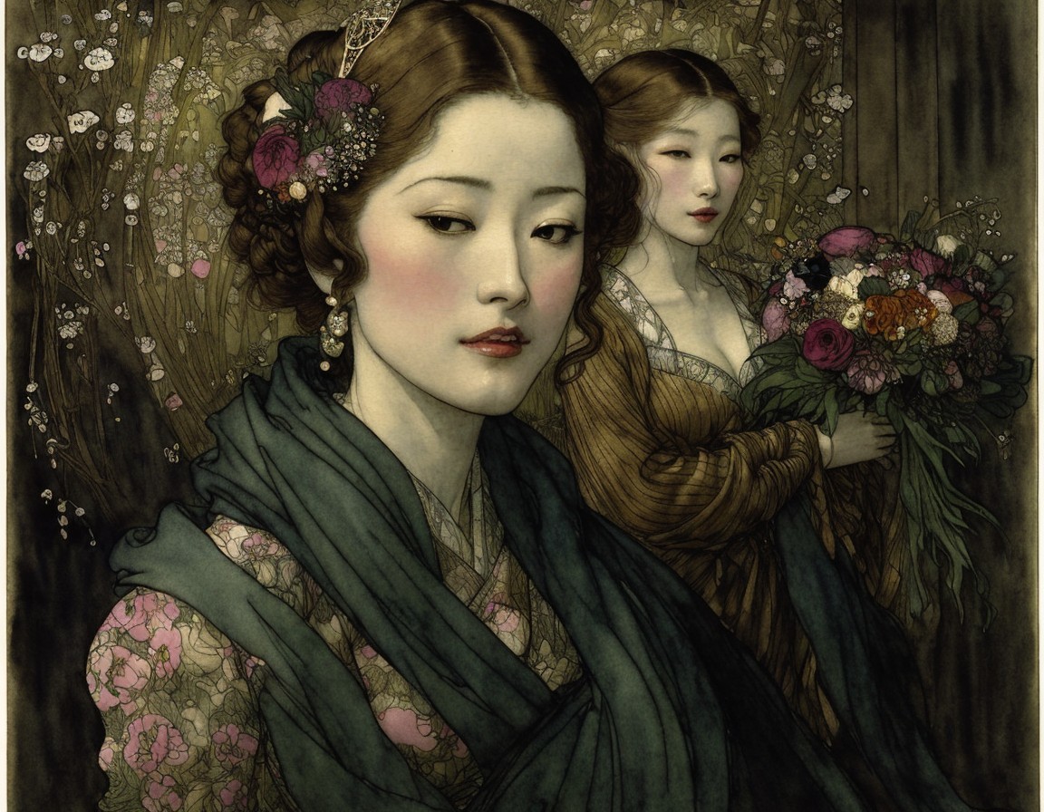 A woman in a traditional kimono, adorned with intricate floral patterns, gazes gracefully. Her hairstyle features blooms, blending elegance with the vibrant backdrop of flowers.