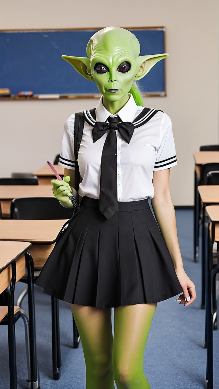 A green-skinned alien girl dressed in a school uniform with a white blouse, black tie, and pleated skirt walks confidently through a classroom filled with desks.