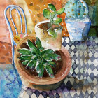 A vibrant watercolor scene featuring a colorful boat filled with plants, moored beside charming, sunlit houses with colorful facades, all under a dramatic, cloud-streaked sky.