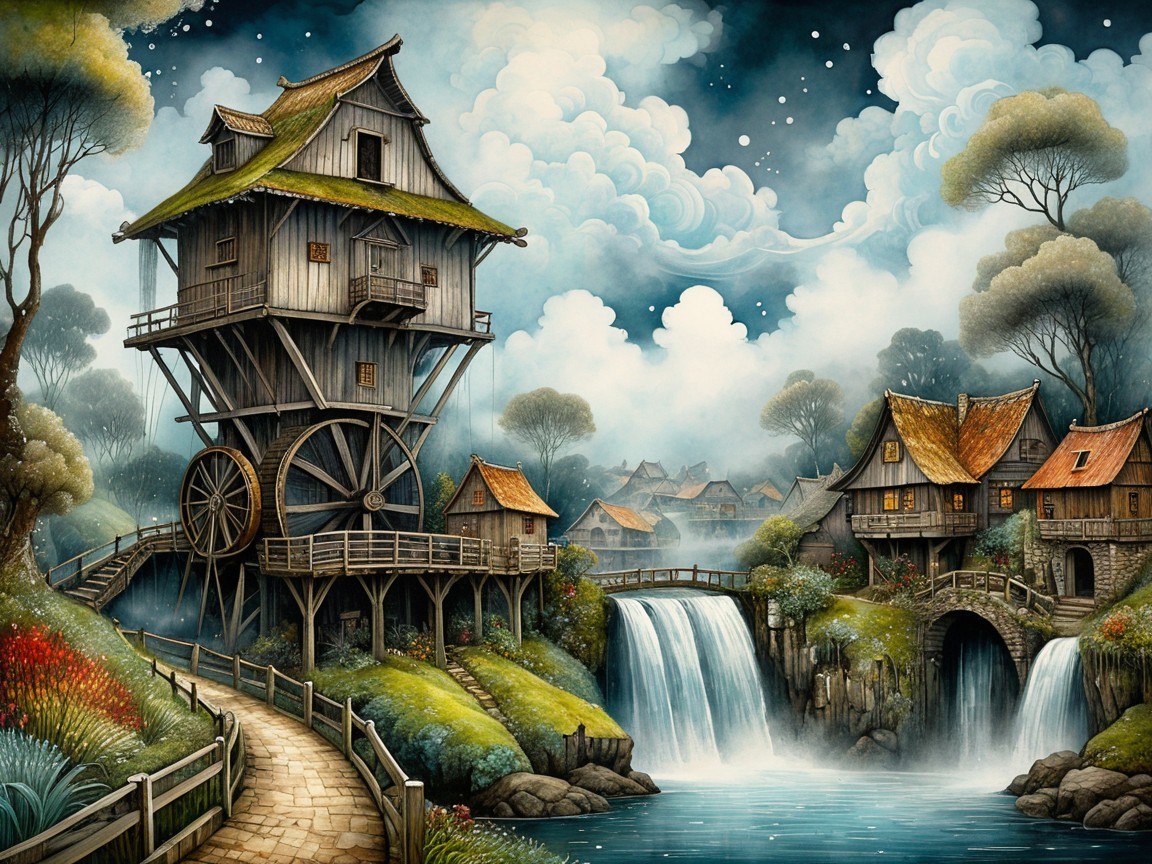 A giant fantasy waterwheel powering an entire floating village in the clouds. The waterwheel-powered village in the clouds sits amidst a waterfall, majestic trees, patches of grasses, meandering path; layered, arched, fragmented, vibrant colors of blue, green, rust, brown, and gold tones, night sky, pale moon;