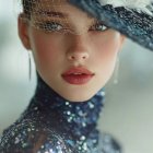 A young woman with striking blue eyes and soft features wears an elegant blue hat adorned with flowers. Her lace dress glimmers softly in the light, creating a graceful and sophisticated look.
