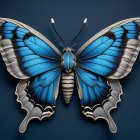 The image features a futuristic character with intricate armor resembling insect features. She has large, vibrant blue butterfly wings and a sleek, stylized body design, blending elegance with strength.