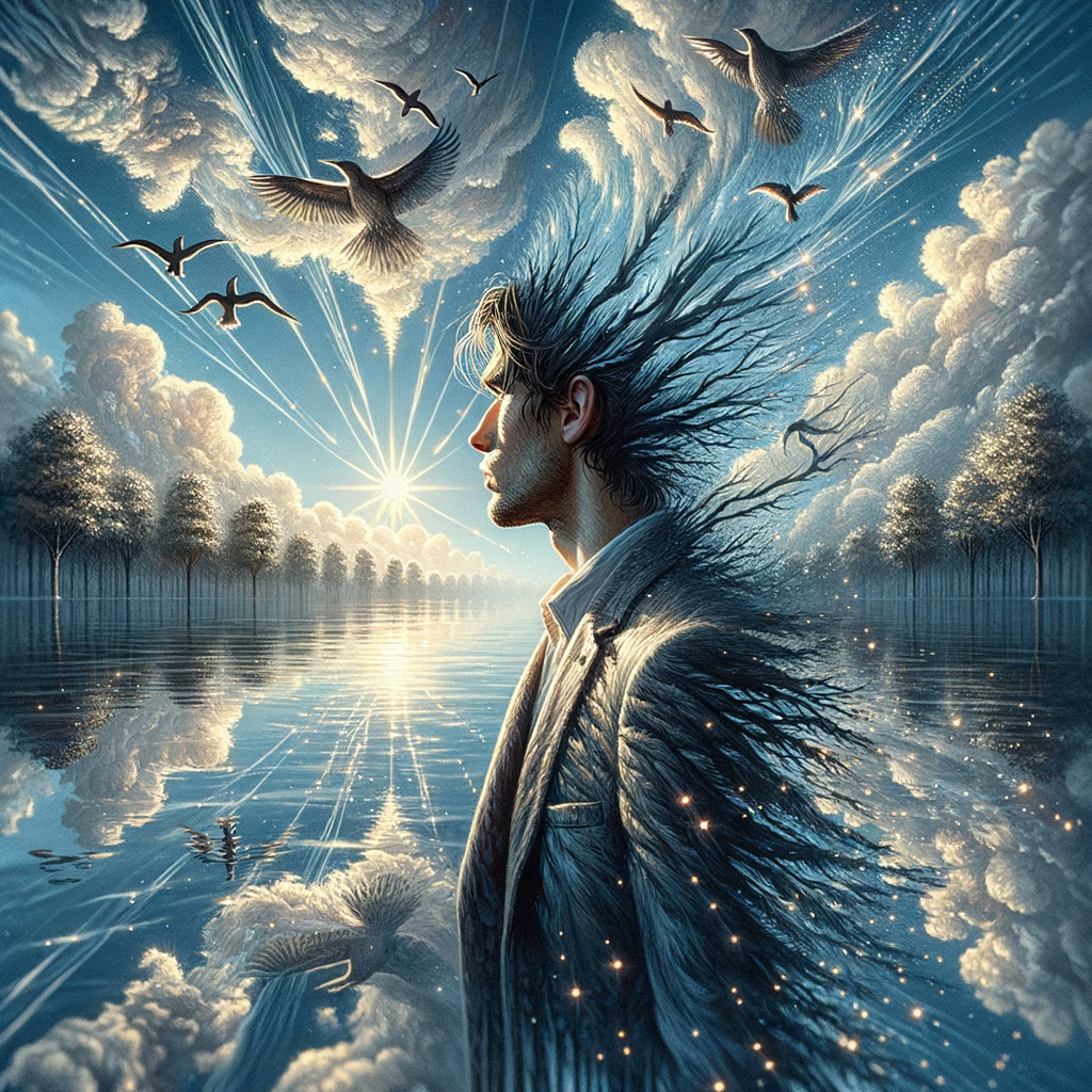 Prompt: he looked like the most lonesome person on earth. He looked at the birds darting above the water and the streaks of sunlight that struck the lake and scattered into thousand tiny bobbing specs on the water. blue gradient sky, feathery clouds.quality dynamic motion work of art fine line art Josef kote visual impact Oleg Shuplyak diaphanous cosmic elements highly detailed, digital painting, abstract, surreal,Wassily, Kandinsky, Jean-Baptiste Monge Ultra, high definition super polished Layered intricacies deep rich colors exceptionally creative masterful artistry sharp focus extremely detailed Award winning photography 8k very attractive dynamic lighting fantastic view 4K 3D high definition crisp quality