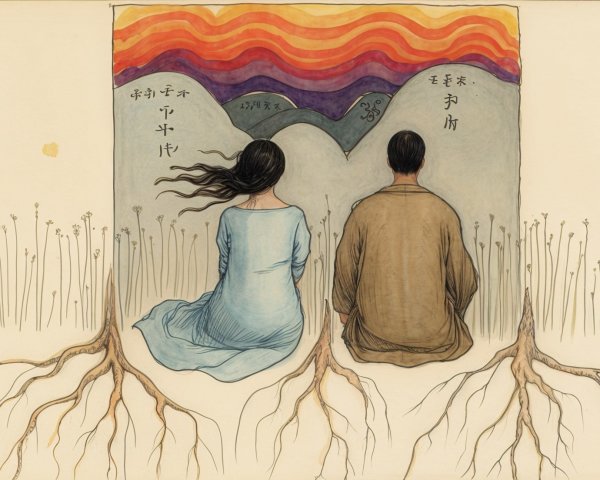 Subtle circuit-like patterns should be incorporated into the ground like roots, rhizoma connecting plamntgs and people, merging nature and technology. The overall colour palette should be warm and earthy with gold highlights to convey a sense of harmony and balance between nature and the spirit. The background should be a soft gradient to enhance the scene's dreamlike quality.
