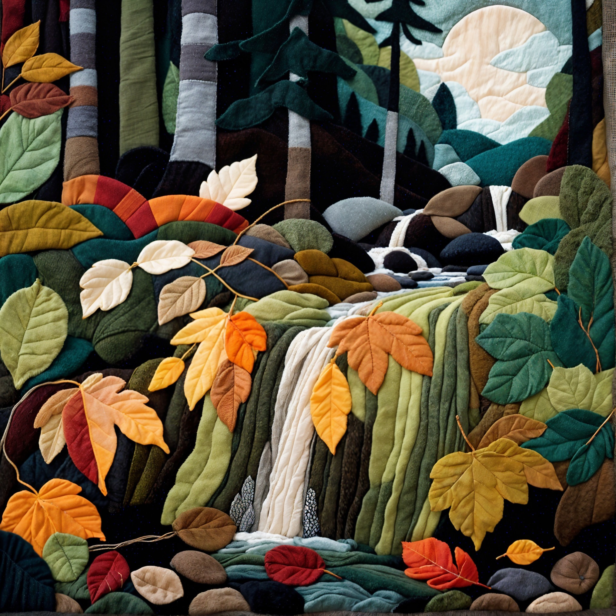 This vibrant quilted artwork features a serene waterfall surrounded by lush greenery and colorful autumn leaves, set against a backdrop of tall trees and a bright, serene sky. Original prompt (revised) Brane Frankovic