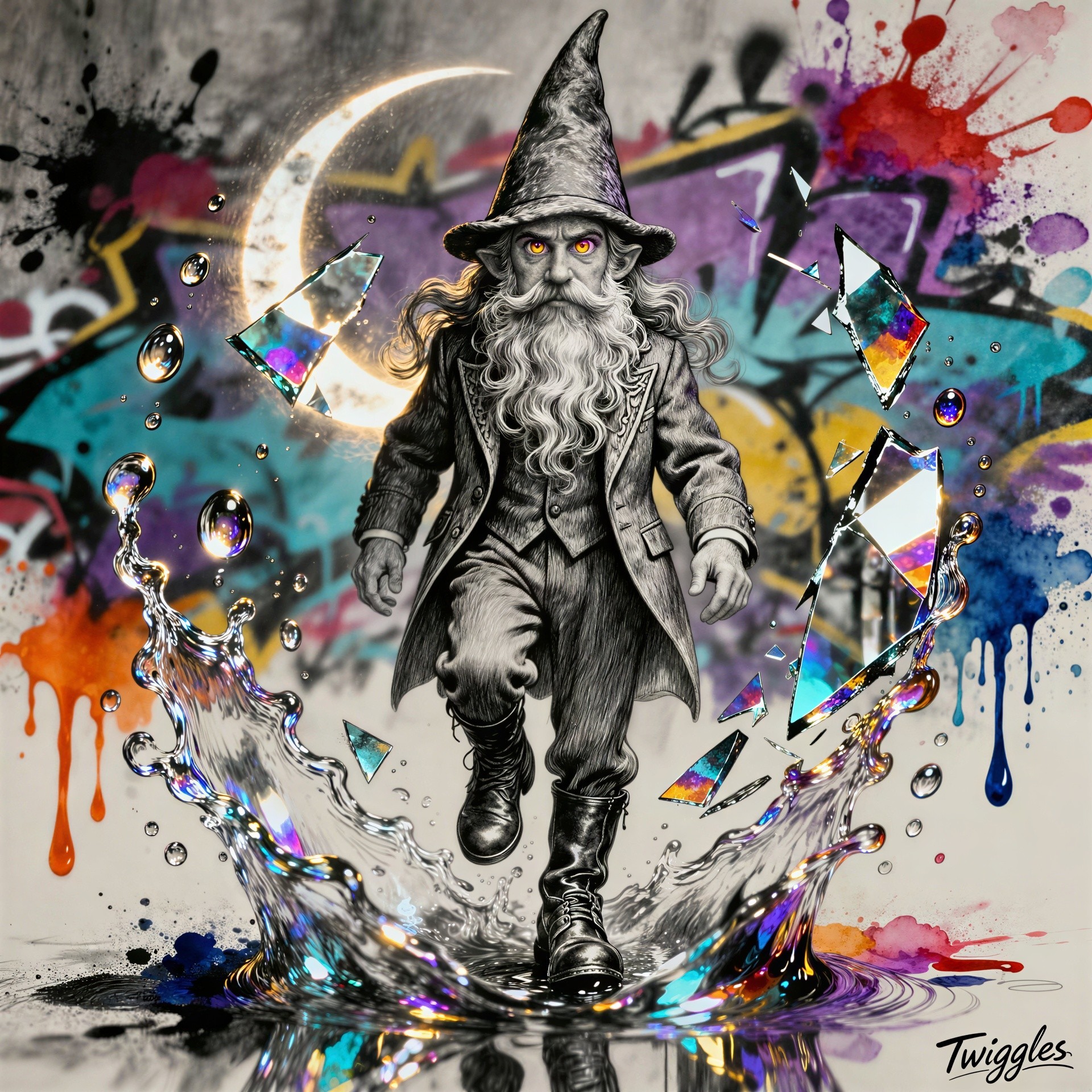 A full-body charcoal drawing of a gnome with a long white beard and a pointed hat, wearing a long jacket and walking out of splashing water. In the background, there is graffiti and a crescent moon with paint splatters. Shards of glass with colorful reflections are flying around the gnome