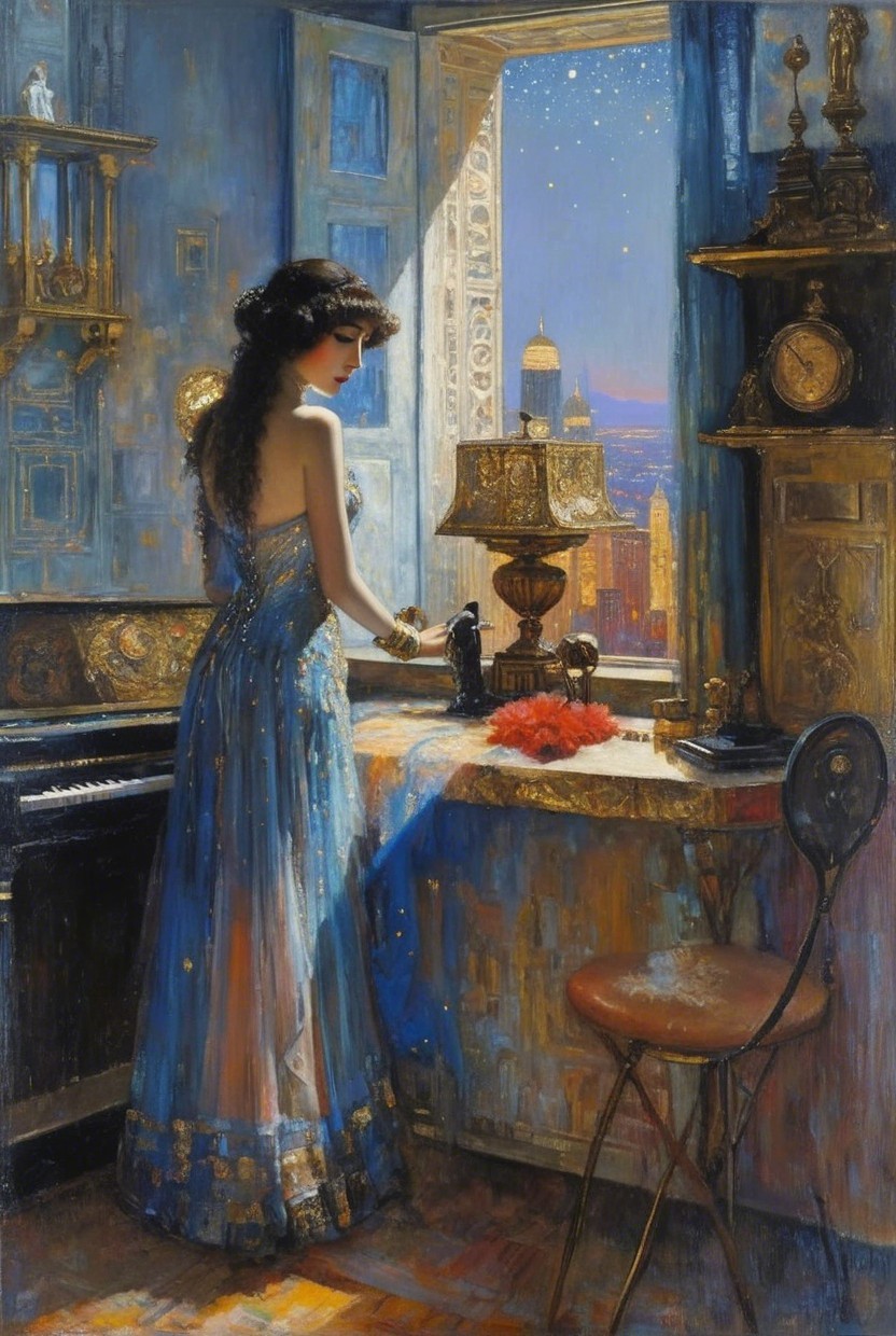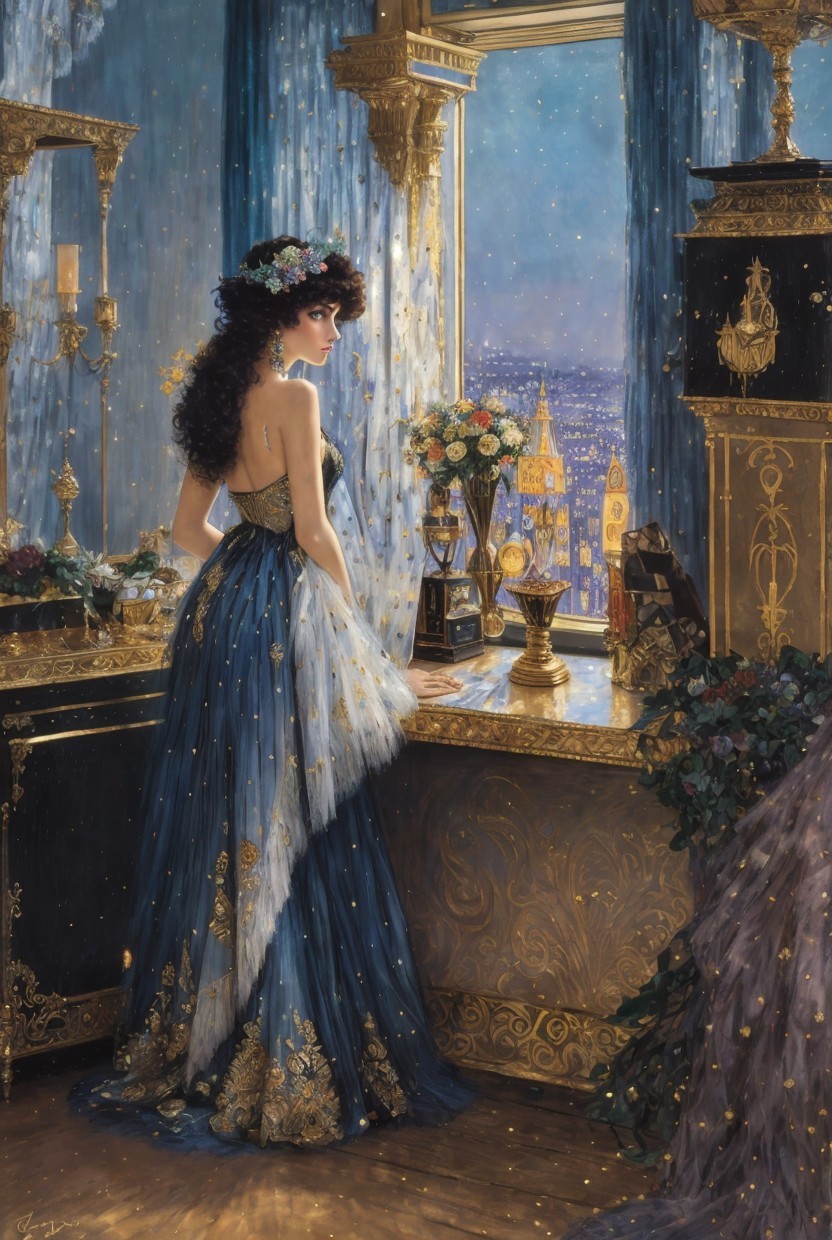 A woman in a stunning blue gown stands by a lavish table, gazing out at the illuminated skyline featuring the Eiffel Tower, bathed in a soft, enchanting twilight. Rich décor surrounds her.