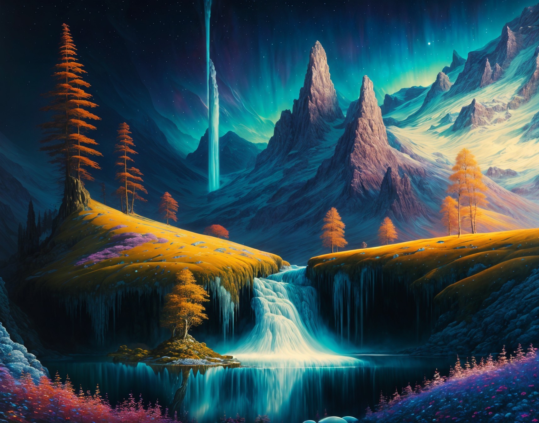 A serene landscape features a majestic tree beside a sparkling river with cascading waterfalls. The scene is set under a cosmic sky filled with stars and vibrant colors, blending nature and fantasy.