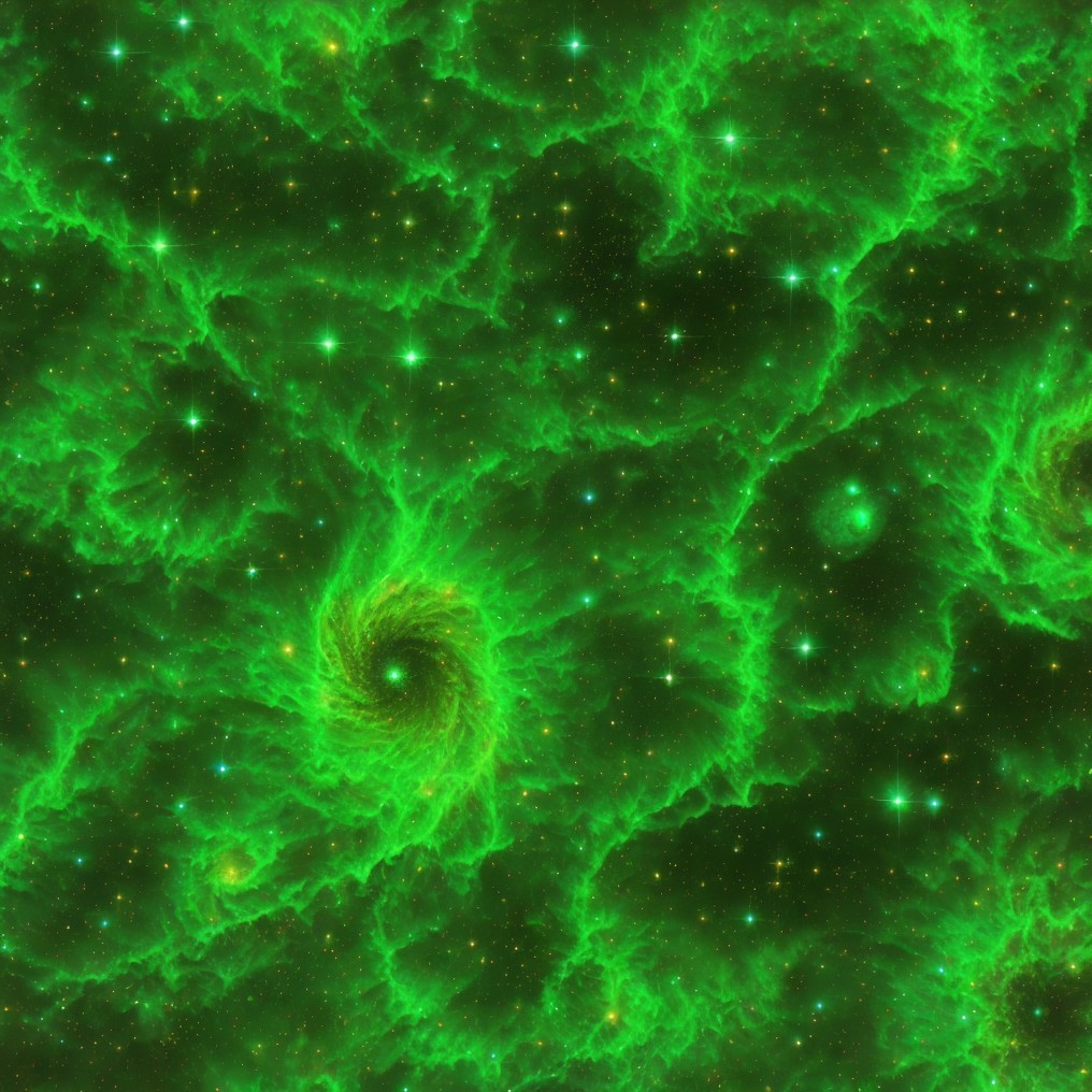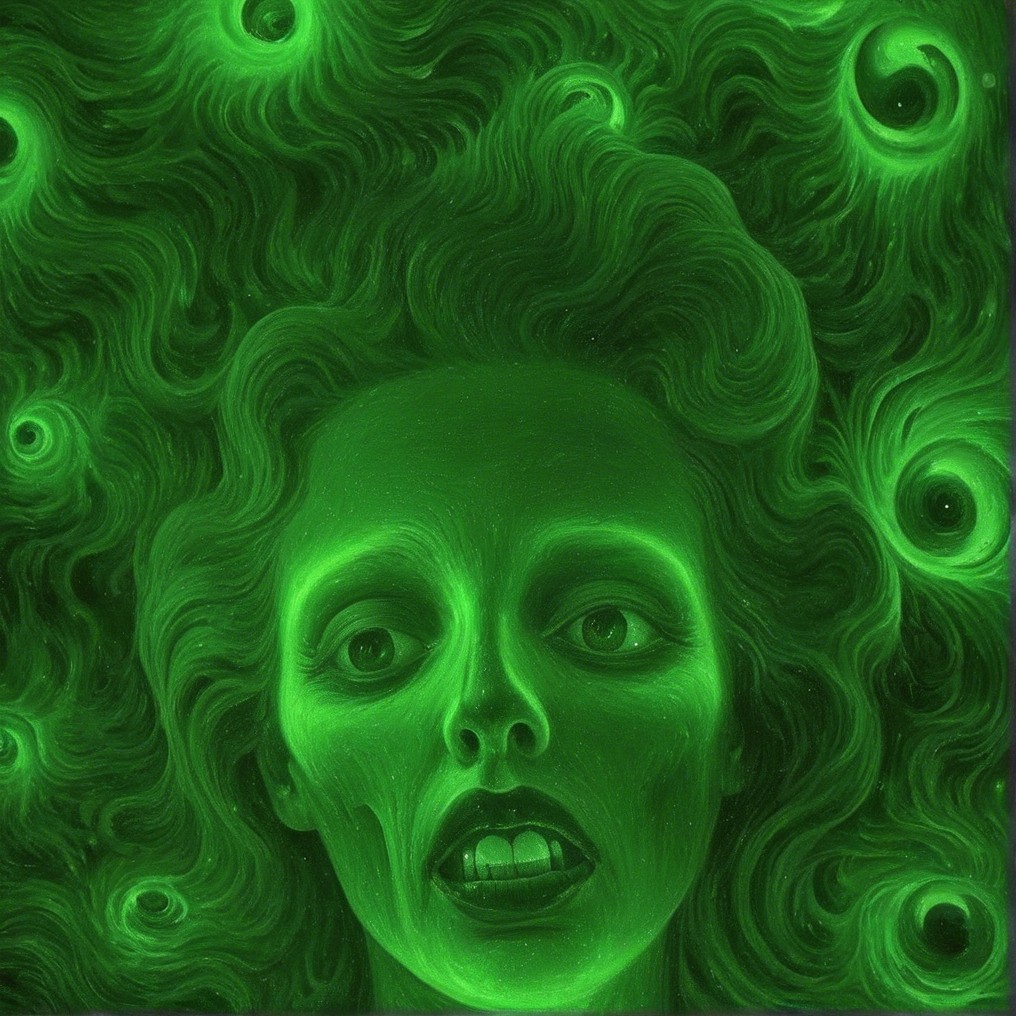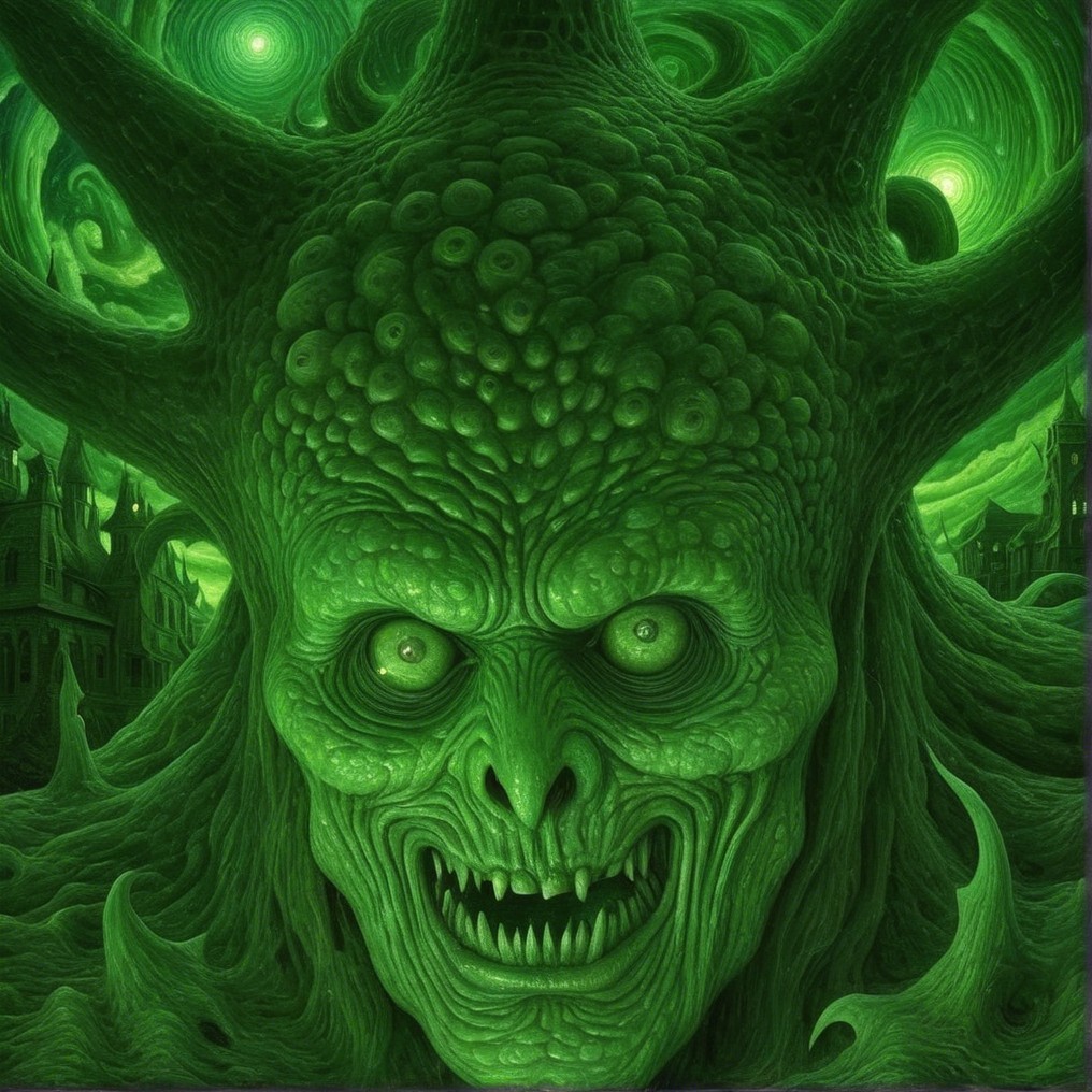A menacing green creature with a textured, scaly face and sharp teeth. Its multiple glowing eyes radiate from a dark background, enhancing its sinister appearance. Spiky tendrils frame its head.