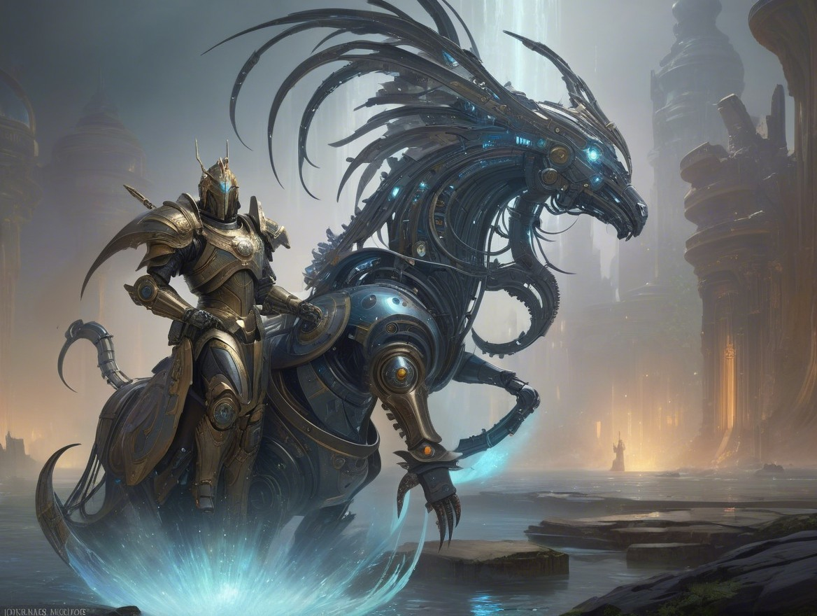 A knight in ornate armor rides a mechanical horse, both adorned with glowing blue accents. They stand in a mystical landscape of towering structures and ethereal light, exuding a sense of power.