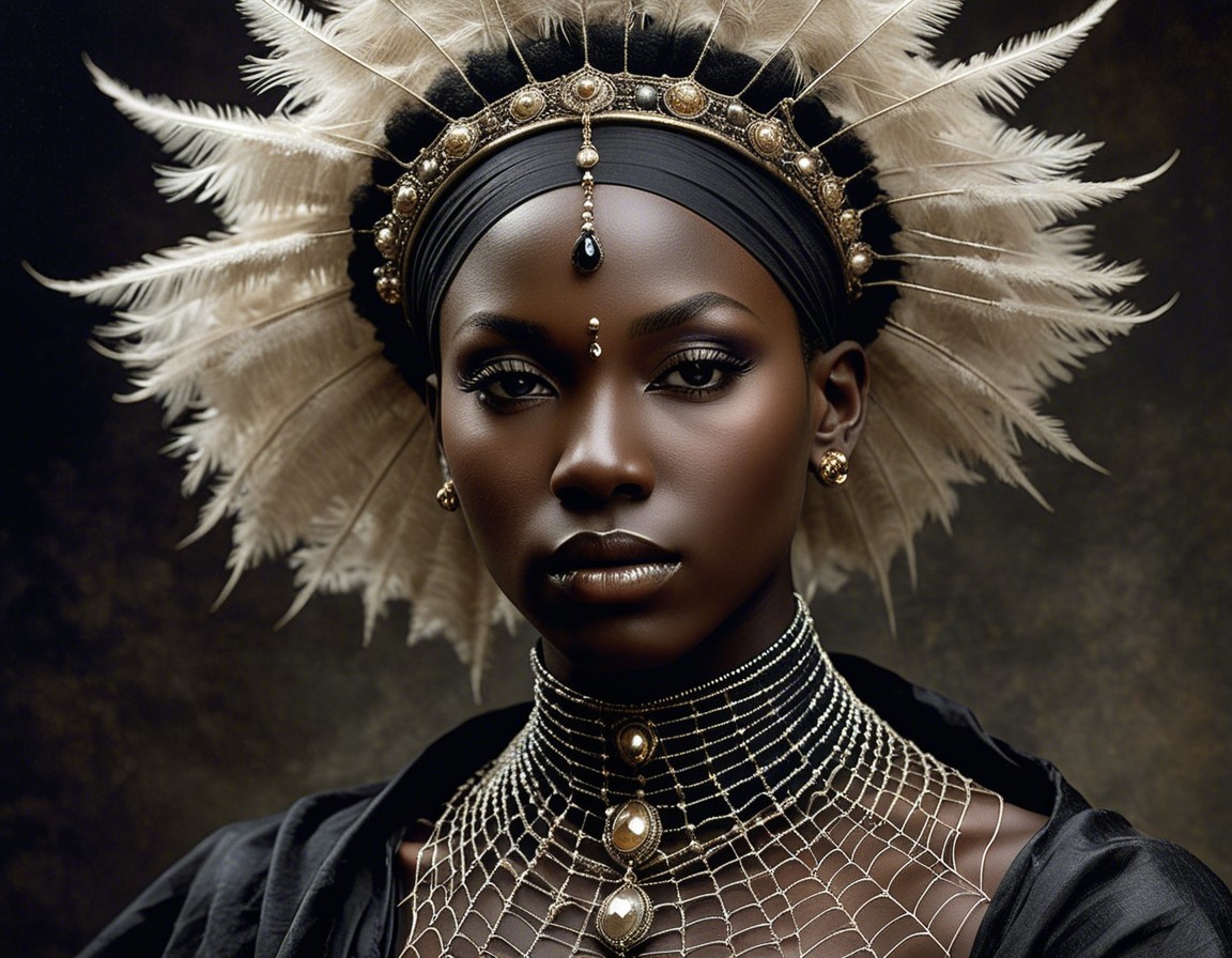 The image features a striking portrait of a model with a bold feathered headpiece and intricate jewelry, showcasing a blend of cultural elegance and modern artistry against a dark background.