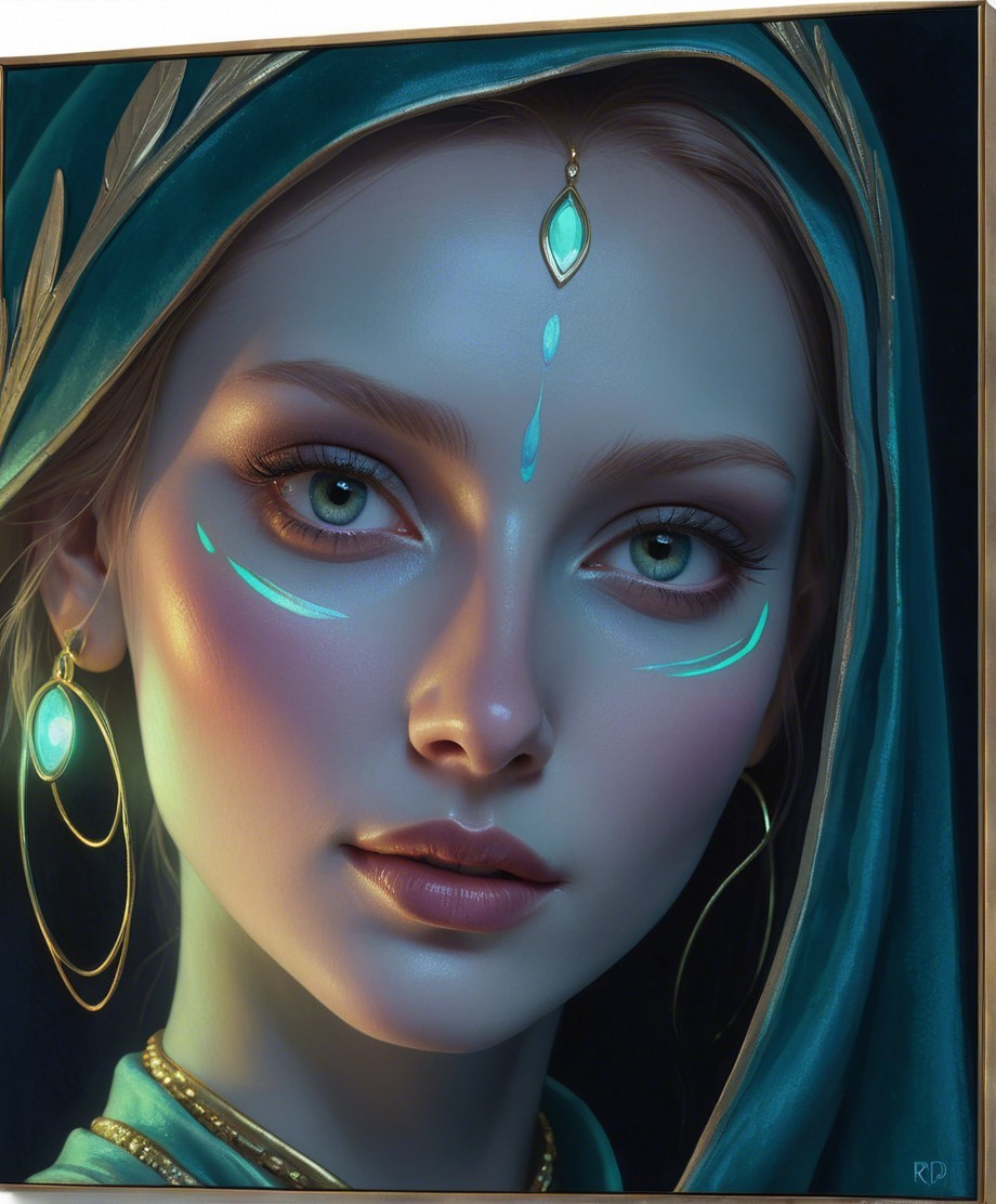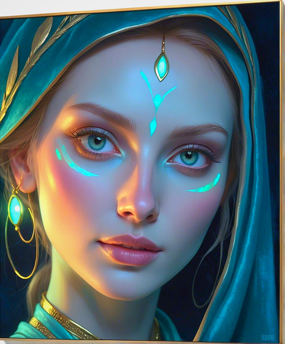 A close-up portrait of a young woman with striking blue eyes and glowing facial accents, wearing a teal headscarf and elegant jewelry, exuding an ethereal and captivating beauty.