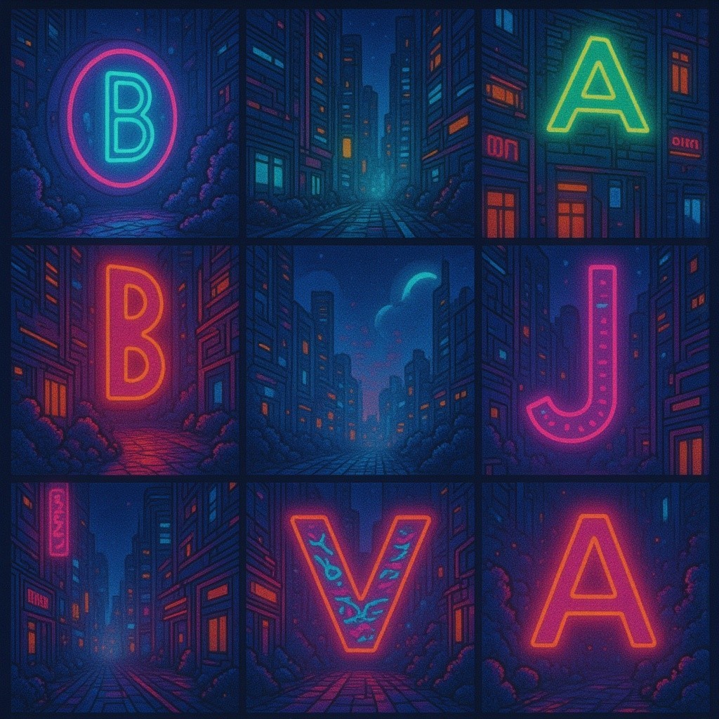 A collaged image of nine sections, each depicting a dark blue cityscape at night, with various neon letters and cityscape elements. The top-left features a cyan 'B' encircled by a pink ring.
