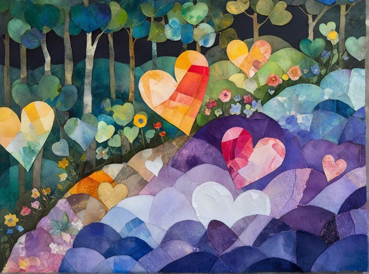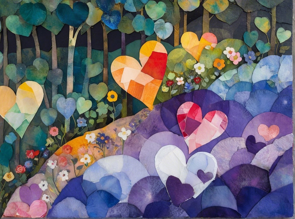 Colorful Hearts Surrounded by Lush Foliage and Flowers