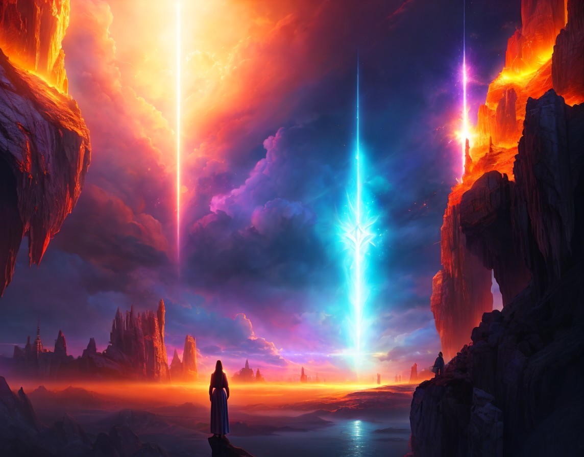 Silhouette of person in sci-fi landscape with radiant beams at sunset