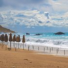 The image features futuristic glass-domed houses perched on rocky shores, surrounded by lush green trees and gentle ocean waves, under a vibrant sky with soft clouds.