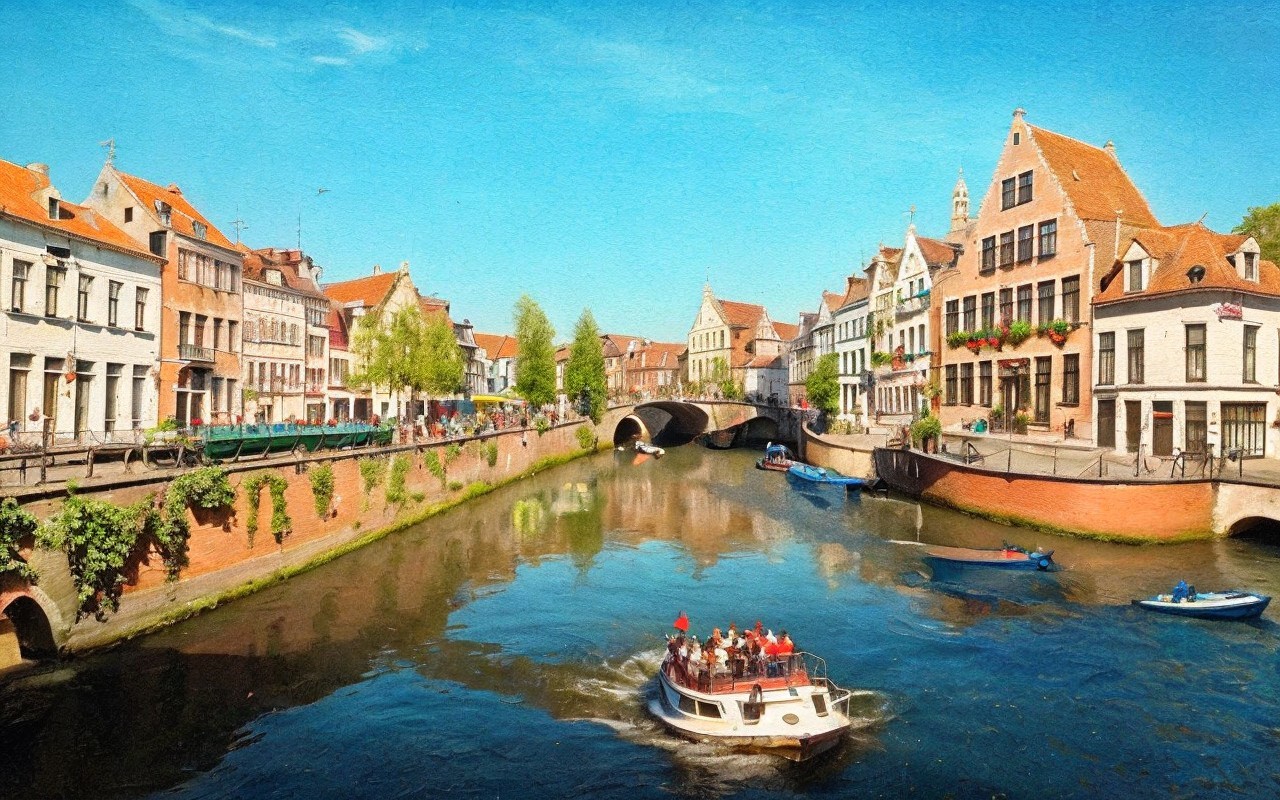 A vibrant waterway scene with boats, historic buildings, and people enjoying a sunny day in a European town.
