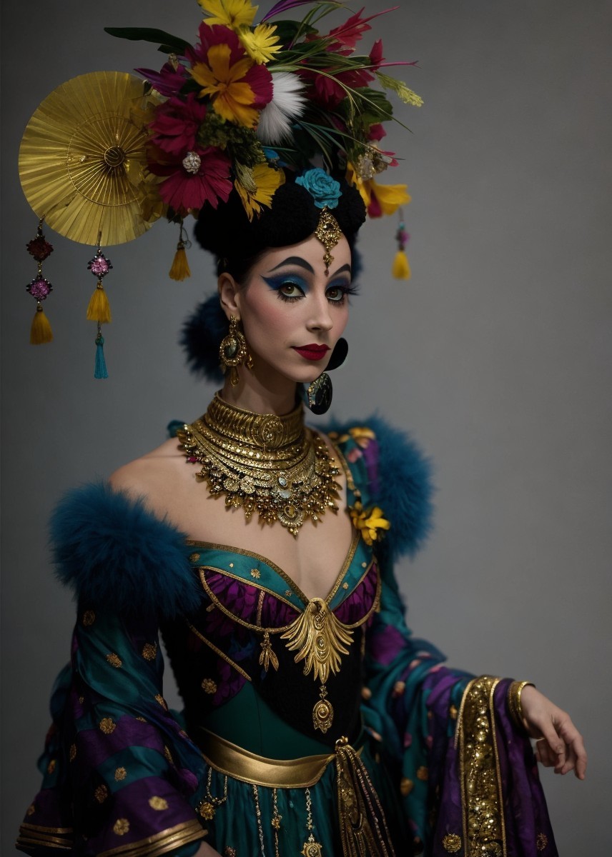 A woman in an ornate costume with feathers, jewels, and dramatic makeup poses elegantly, evoking a theatrical or fantasy theme.