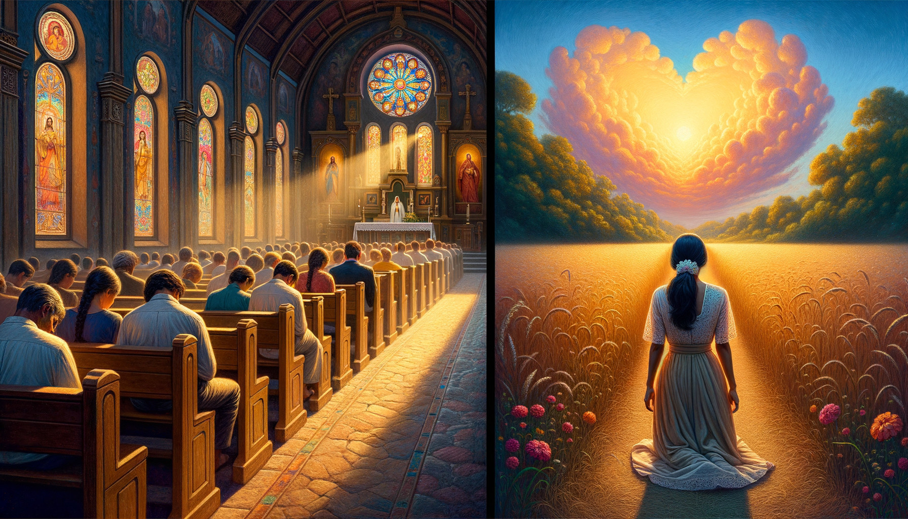 Split image: left shows a church interior with congregants; right, a woman in a field facing a heart-shaped cloud formation at sunset.