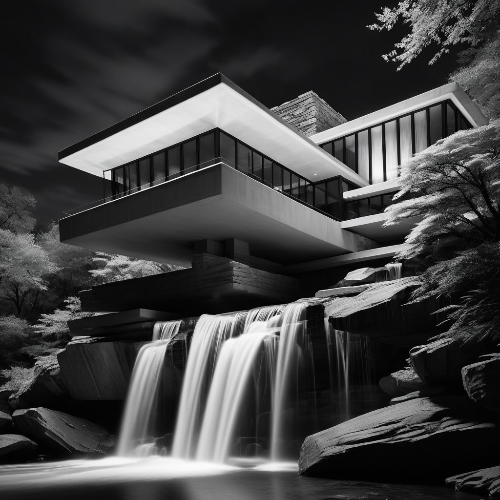 A striking modernist building sits above a serene waterfall, blending seamlessly with its rocky surroundings. Its sleek lines and large glass windows create a dramatic interplay of light and shadow.