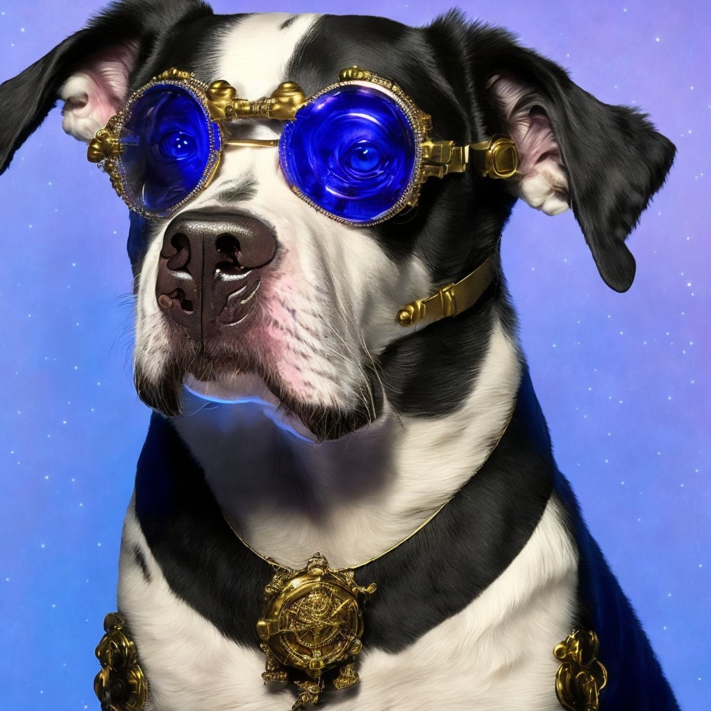 A dog with steampunk-style goggles and attire against a starry background, exuding a futuristic adventurer vibe.