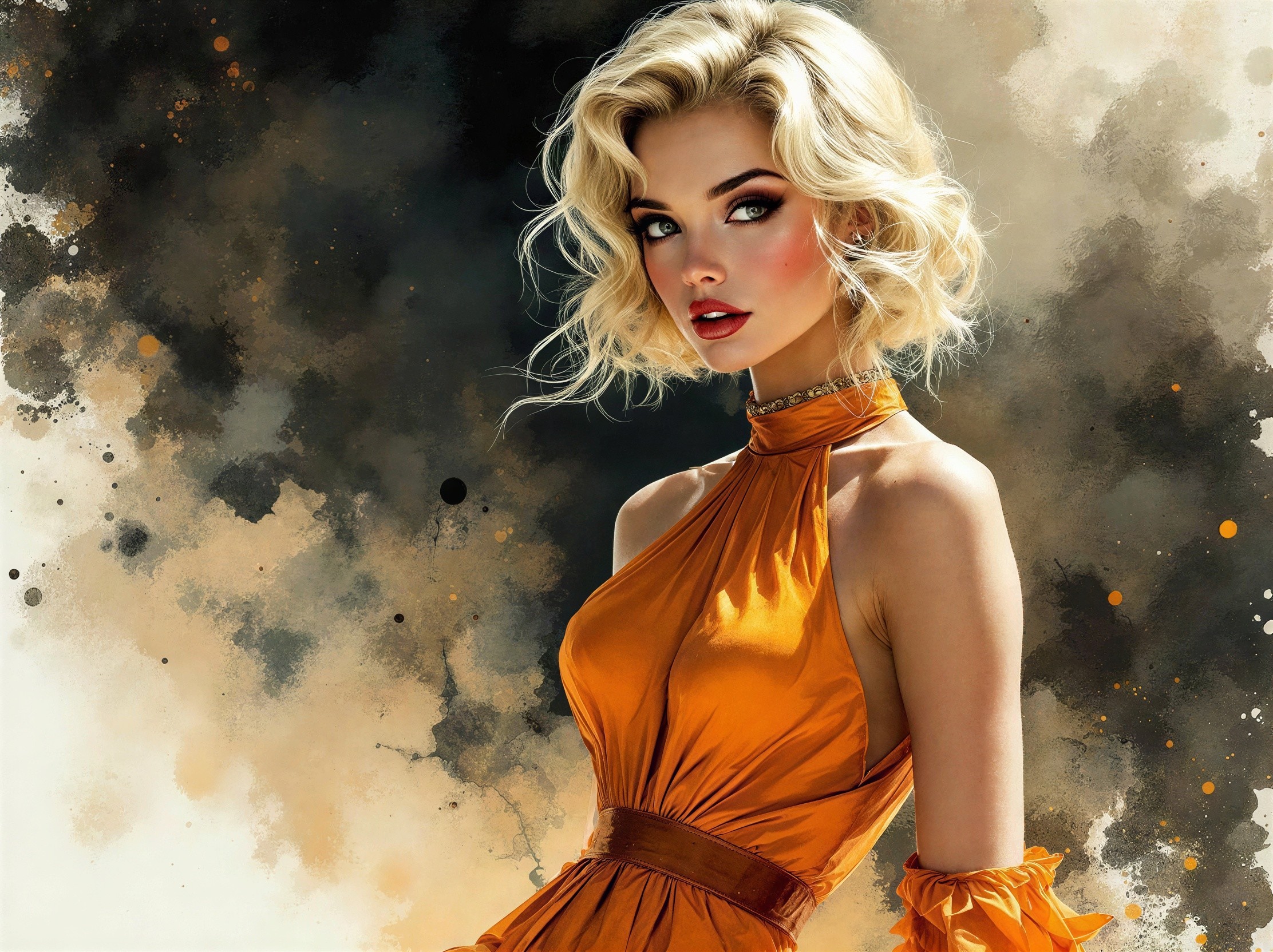 A beautiful woman with blonde curly hair with light makeup, green eyes and full red lips wearing an orange halter top and a thin gold choker, seen from the chest up, on a dramatic abstract smoky charcoal and tan background with scattered dots, in the style of abstract expressionism.