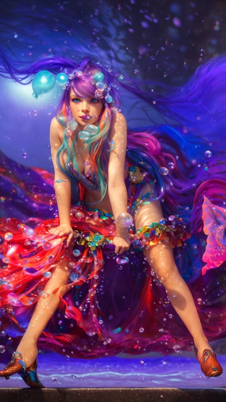 + Prompt:Frontal portrait of a whimsical and colorful woman resembling a mermaid or siren. Fair complexion, youthful features, wide open eyes, and delicate freckles on nose and cheeks. Vibrant, gravity-defying hair in shades of purple, blue, orange, and teal. Hair transitions into tendrils or aquatic flora, creating an underwater illusion. Small bubbles floating around the head add to the underwater theme. Attire or visible body part resembles teal and green fish scales with vibrant colors. Overall effect: Serene and otherworldly underwater creature in quiet contemplation.