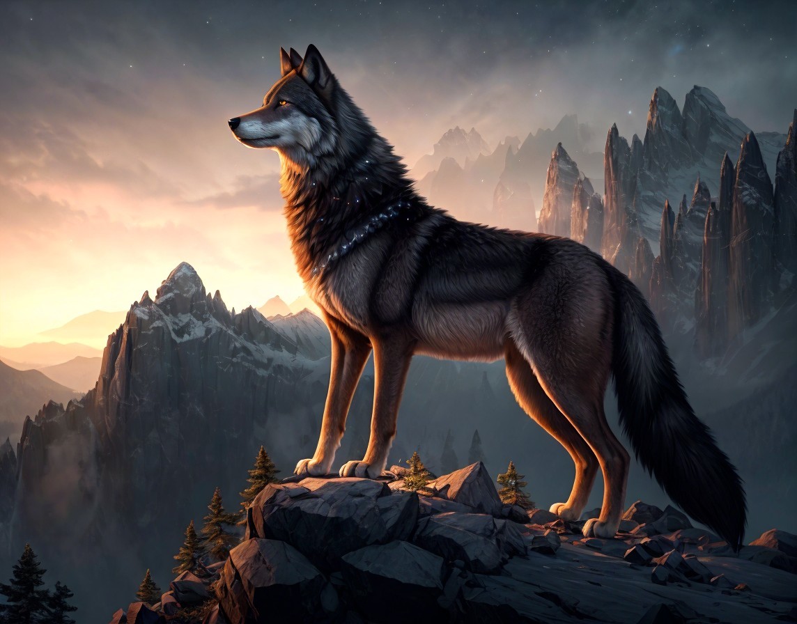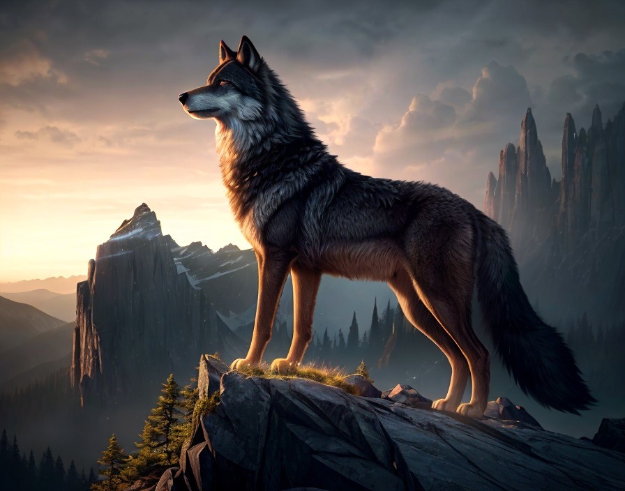 A pack of wolves on a mountainous terrain at twilight, with one prominently standing on a rock.