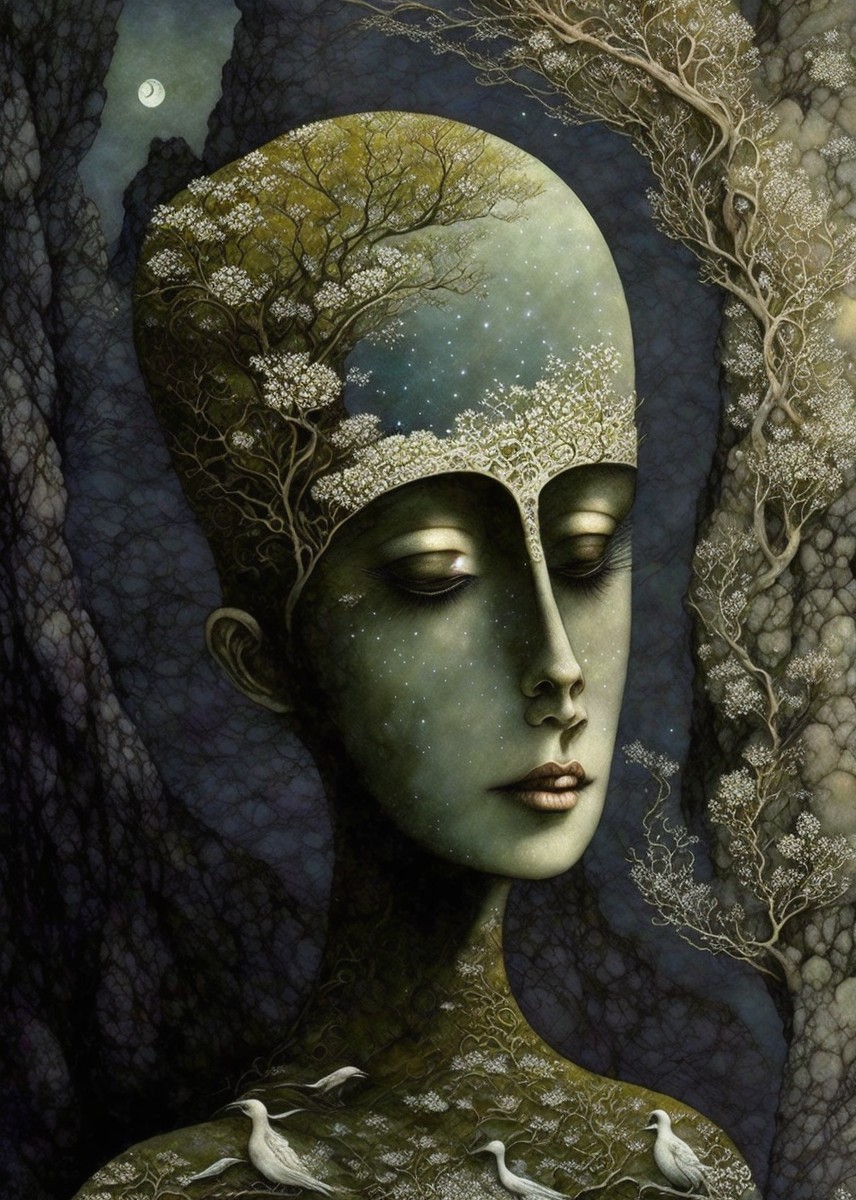 A surreal portrait blending a woman's face with a coastal landscape within a rocky frame, evoking a mysterious, nature-infused atmosphere.