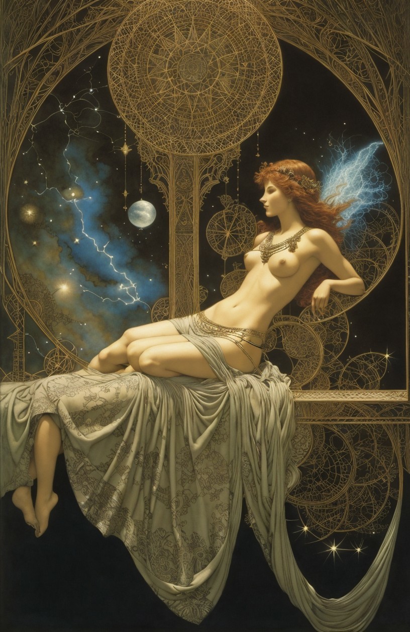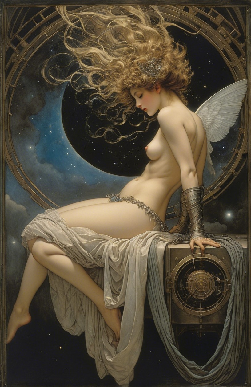A serene female figure with flowing hair and delicate wings sits gracefully, holding a glowing orb. The background is dark, enhancing her ethereal presence and the soft light she cradles.