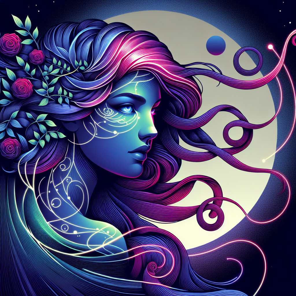 Prompt: "Mythological Greek goddess, bioluminescent hair, thorny rose vines, serene gaze, eyes reflect constellations, stark minimalist gradient background of deep indigo and violet, clean lines, bold color blocks, graphic textures, modern digital vector art, art deco elegance, vibrant colors, flowing hair, intricate details, ethereal lighting, mystical ambiance, intricate patterns, elegant design, digital illustration."