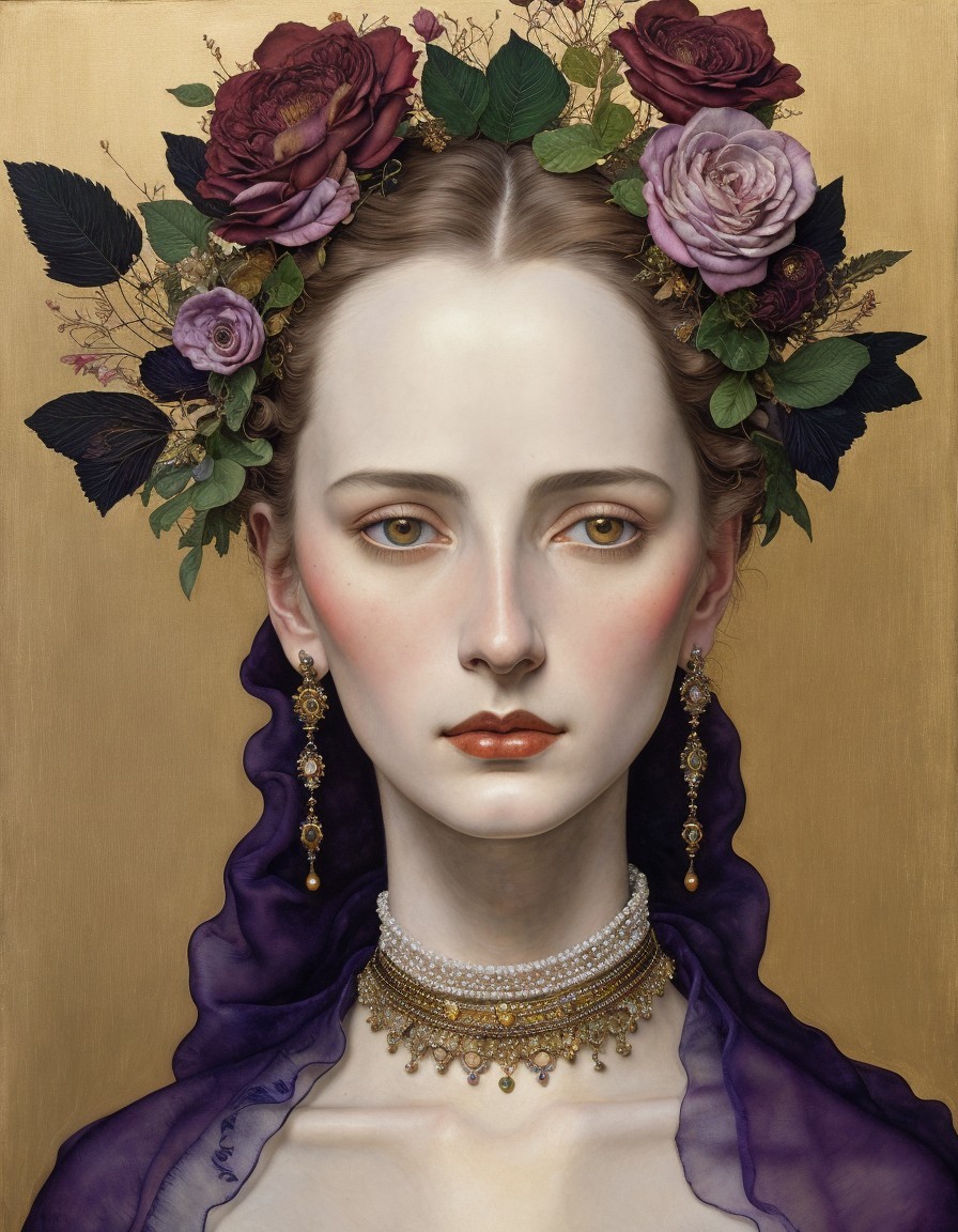 A digital painting of a woman with voluminous curly hair, striking blue eyes, rosy cheeks, and ornate gold earrings against a golden backdrop.