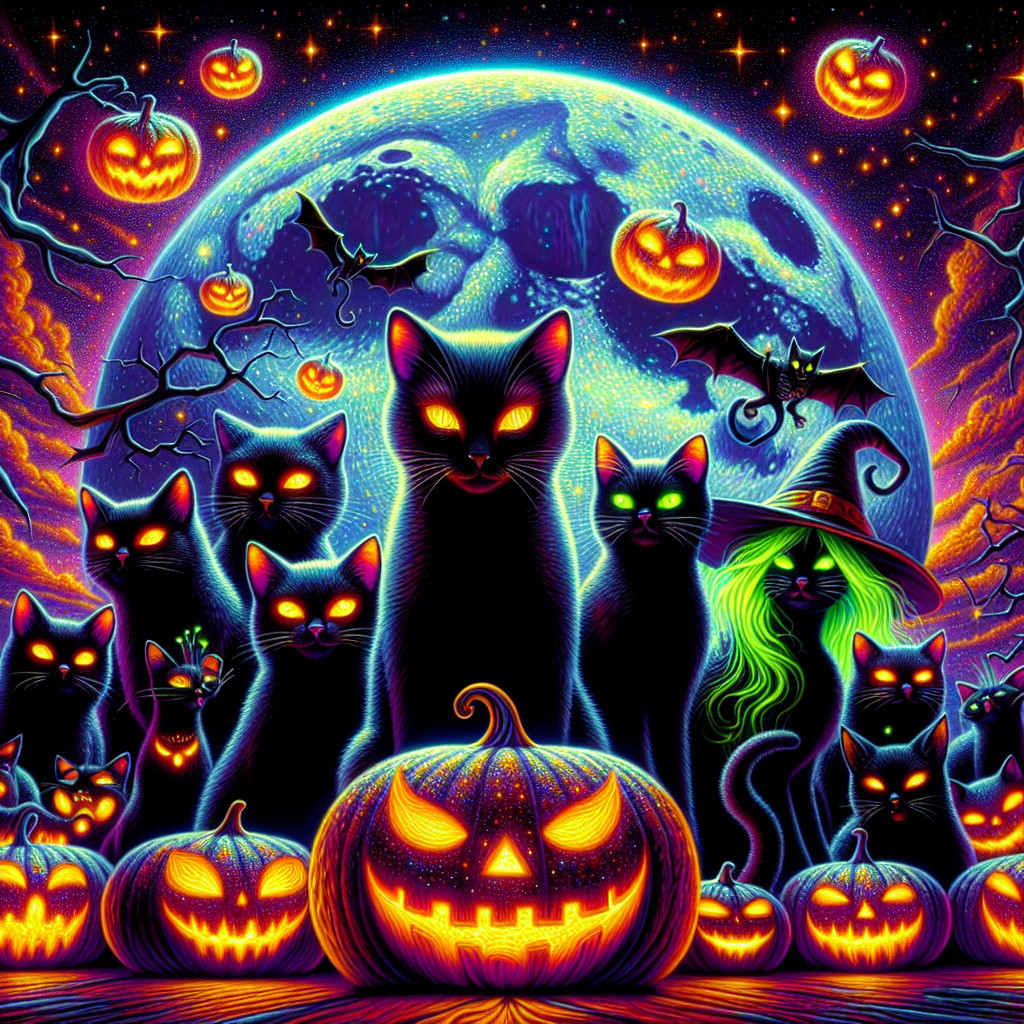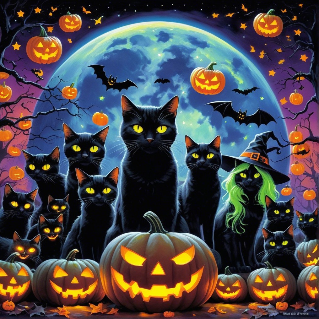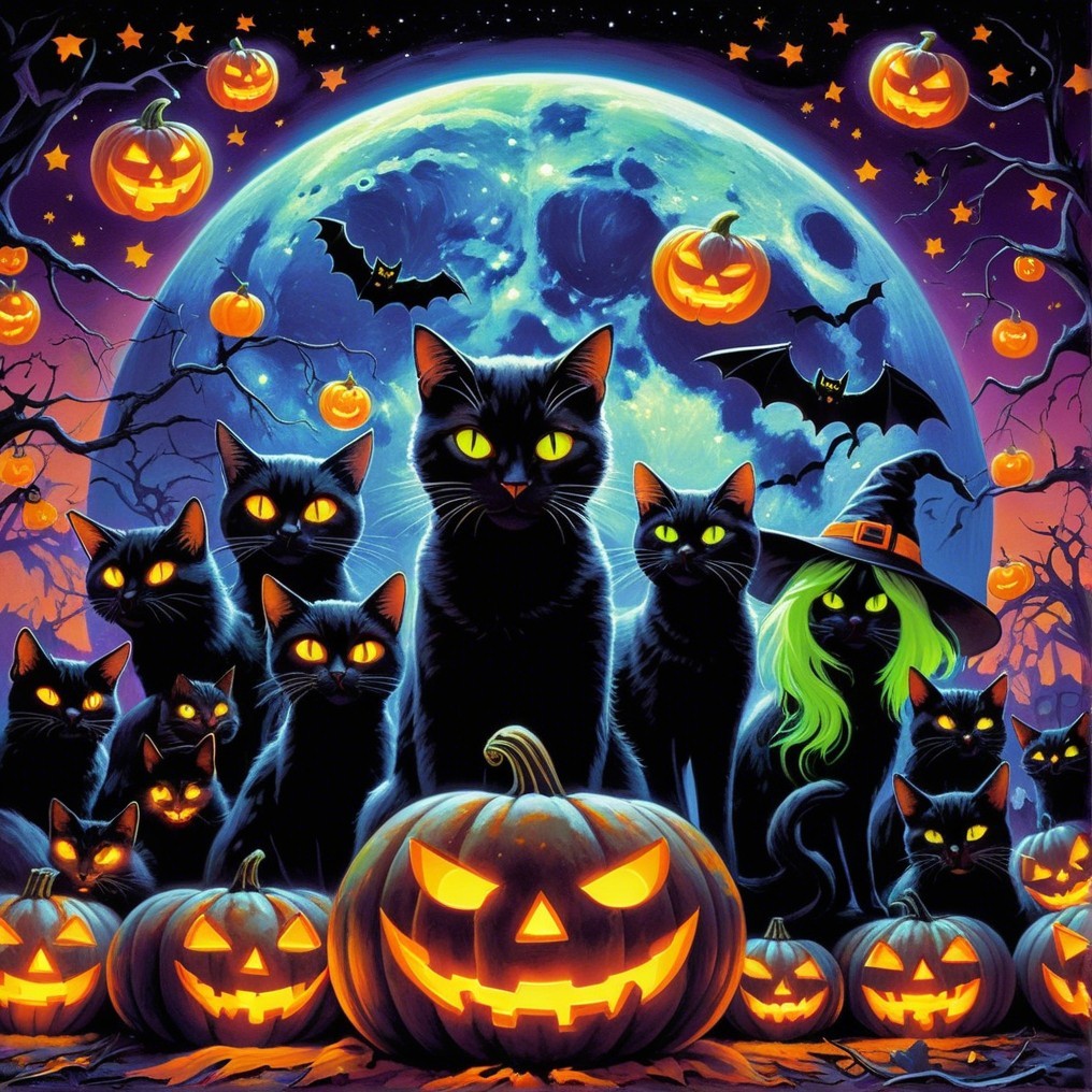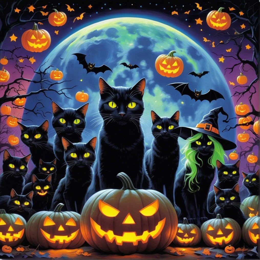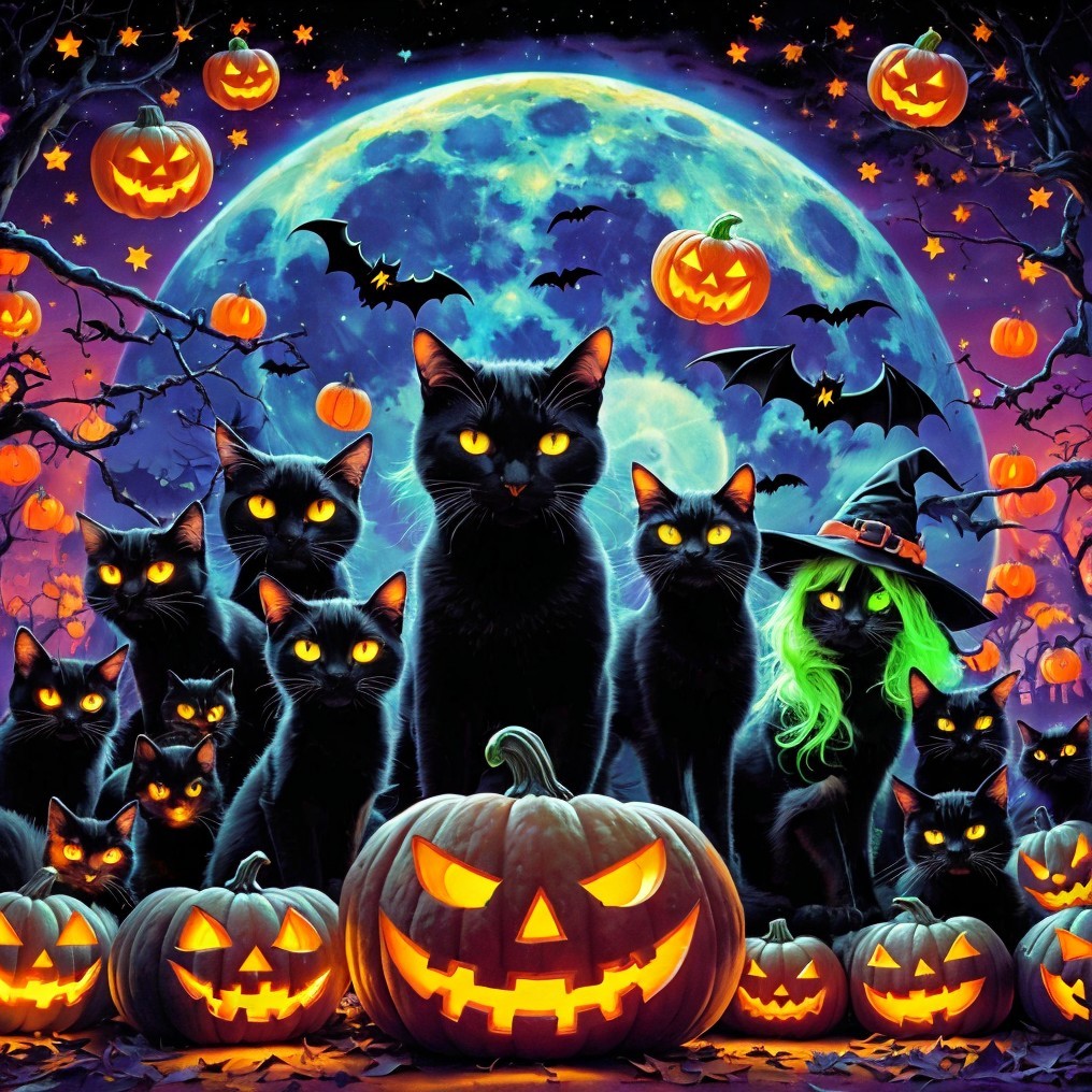 A whimsical Halloween scene features a group of black cats with glowing eyes, surrounded by carved pumpkins and bats under a full moon, creating an enchanting, spooky atmosphere.