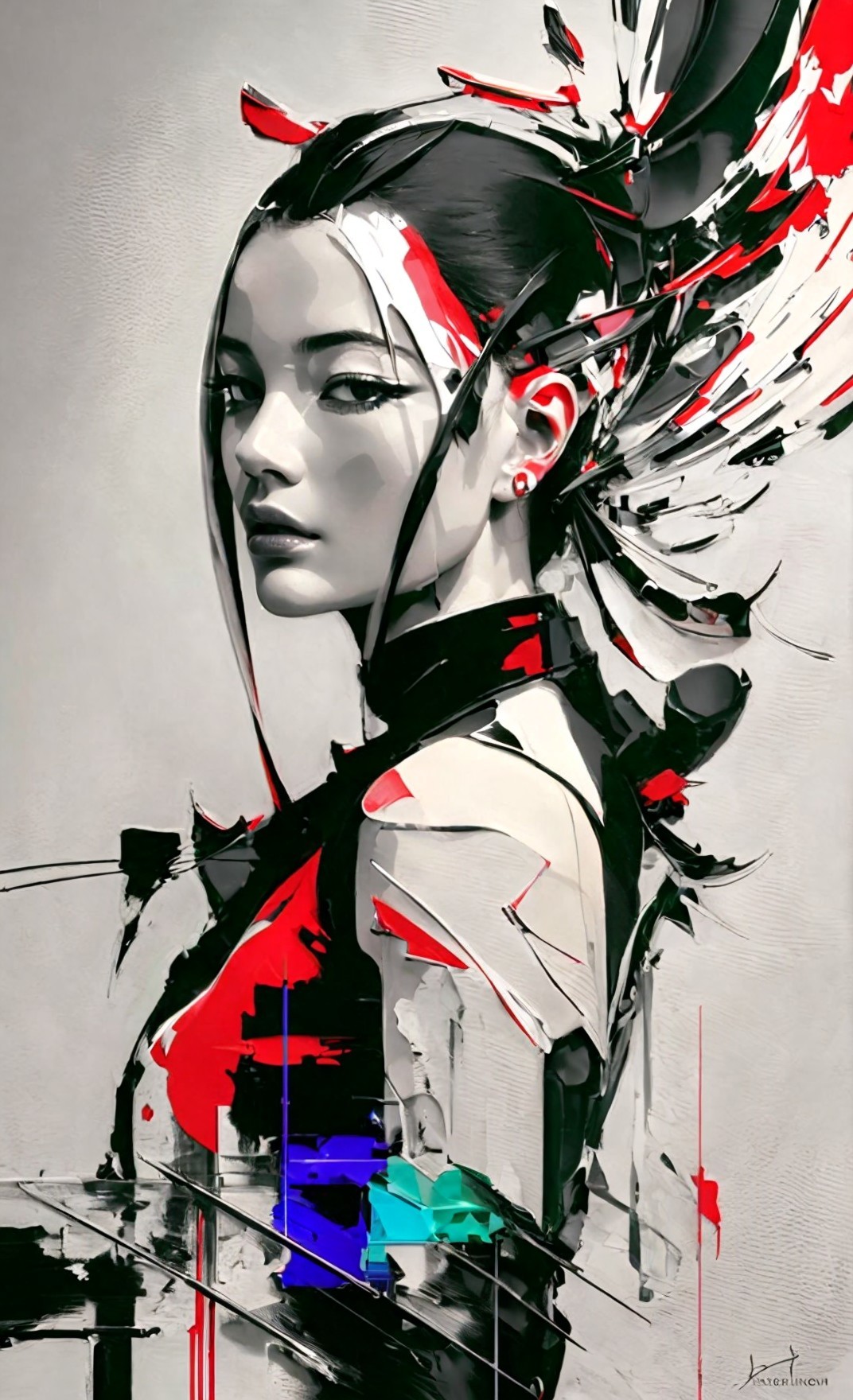 A digital artwork of an alluring woman with monochrome tones and abstract red and blue elements extending from her head like a headdress.