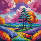A vibrant landscape bursts with color, featuring rolling hills, stylized trees, and dramatic clouds. A winding path leads through a fantastical scene of purple, orange, and turquoise hues.