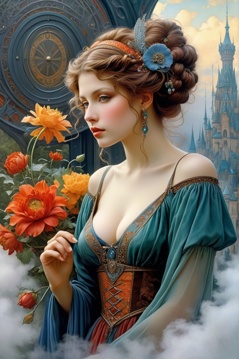 A young woman with flowing hair adorned with flowers stands before a grand castle. She wears an elegant gown, blending historical elegance with dreamy, fantastical elements.