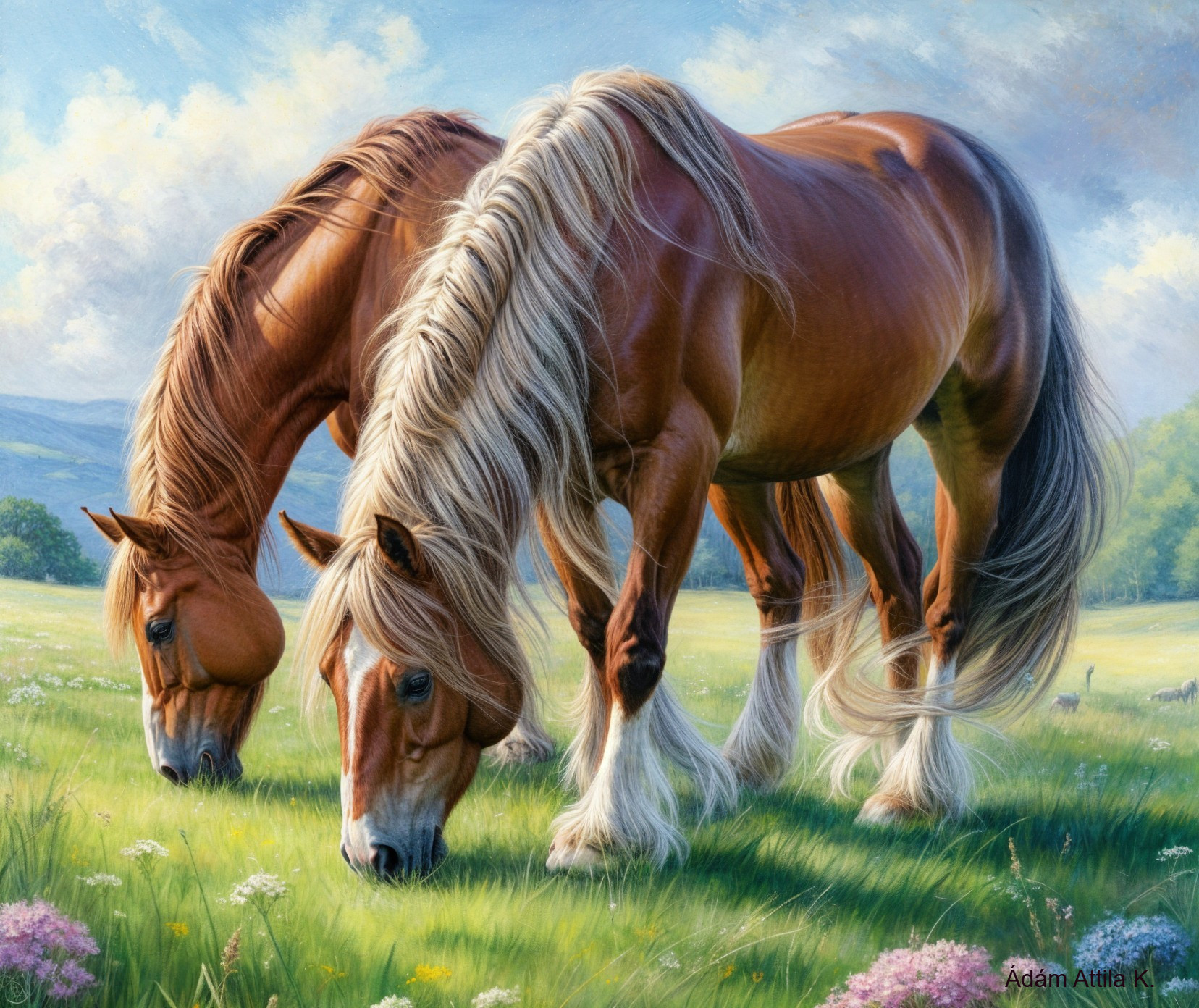 Ultra photorealistic painting of two beautiful, long-maned, shiny brown horses grazing in a meadow in a valley. A mountain range is faintly visible in the background.