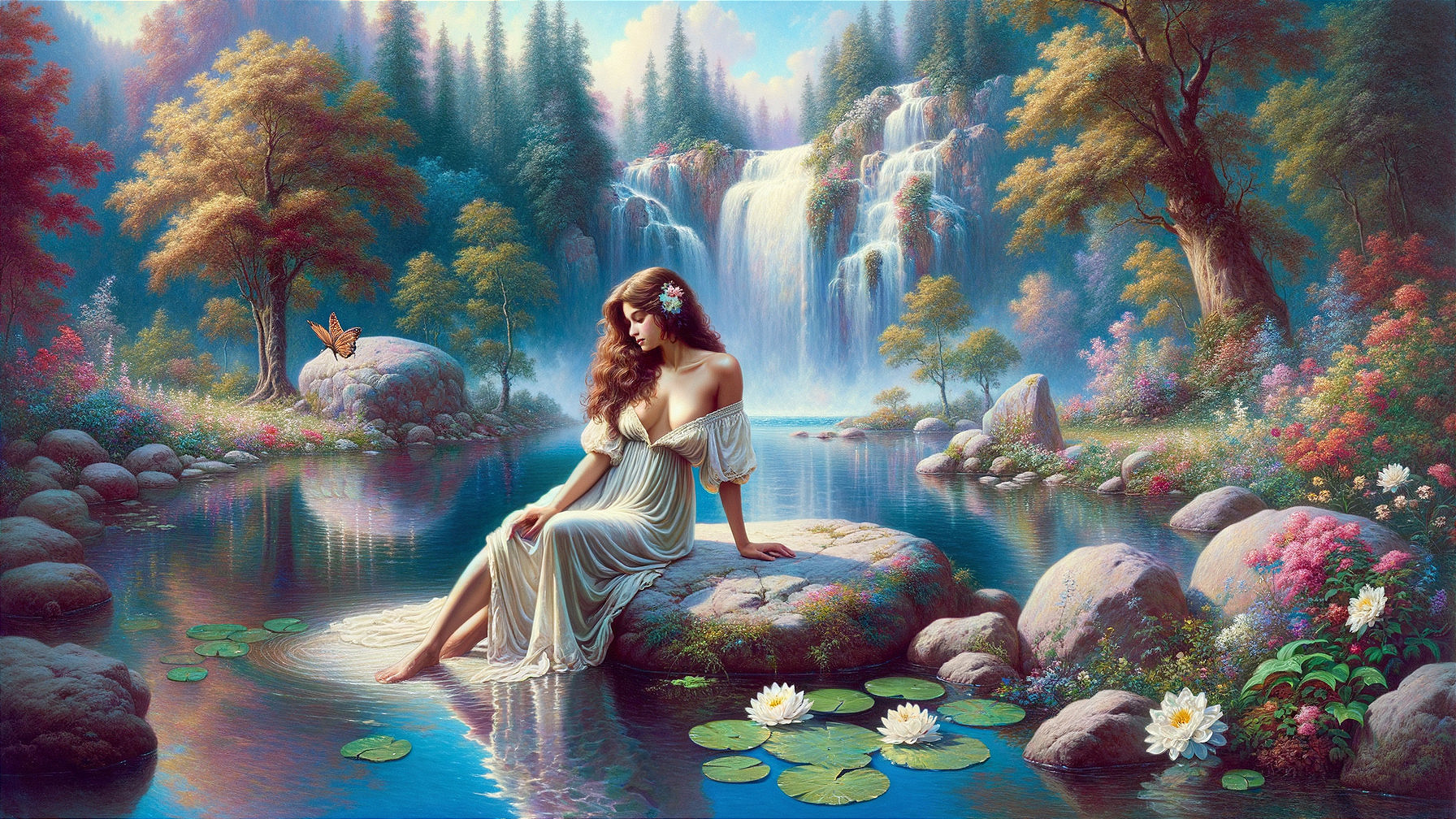 A stunning painting depicts a woman in a flowing white dress, seated on a rock by a vibrant blue pond. A waterfall and lush surroundings create a mystical atmosphere, enhanced by delicate details.