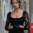 A woman with elegantly styled hair in a bun wears a black lace dress. She stands against a backdrop of green and muted tones, exuding a poised and sophisticated demeanor.