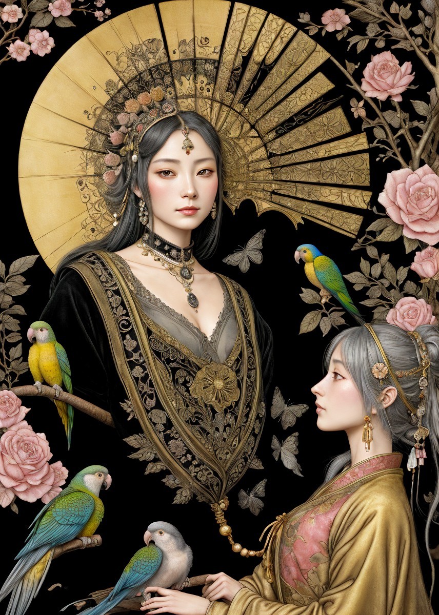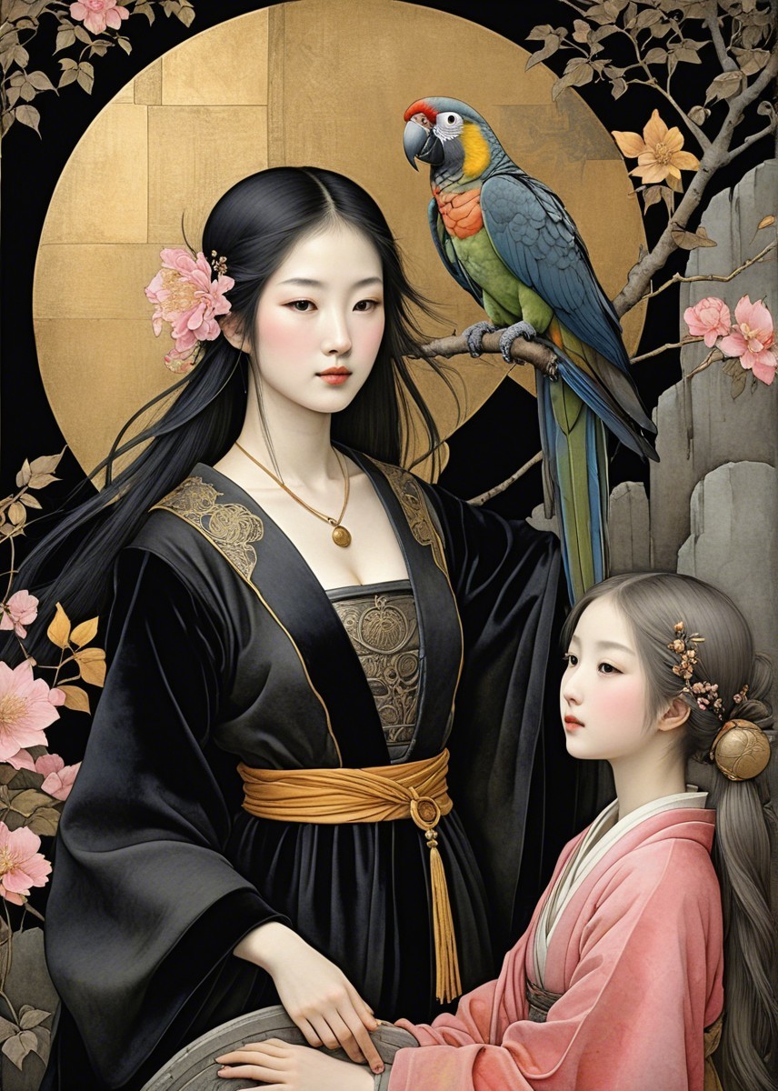 Legend of the Girl and the parrot, Medieval Japanese Artists Sumi-e Style, Velvet Black, Shabby, Dull Gold, Amber Gray, pink, Golden Ratio, Surreal Fantasy, Elegant, High Definition Ultra Fine 3D Line, Zenangle Style, Watercolor Patchwork , Arthur Rackham Style, Paul Kidby, Gediminas Prankevicius, Jacek Jerka, Extremely Detailed, Intricate, Thoughtful, HDR, Fractal, Beautiful, Award Winning, Fantasy Look, Fantasy, Crisp Quality