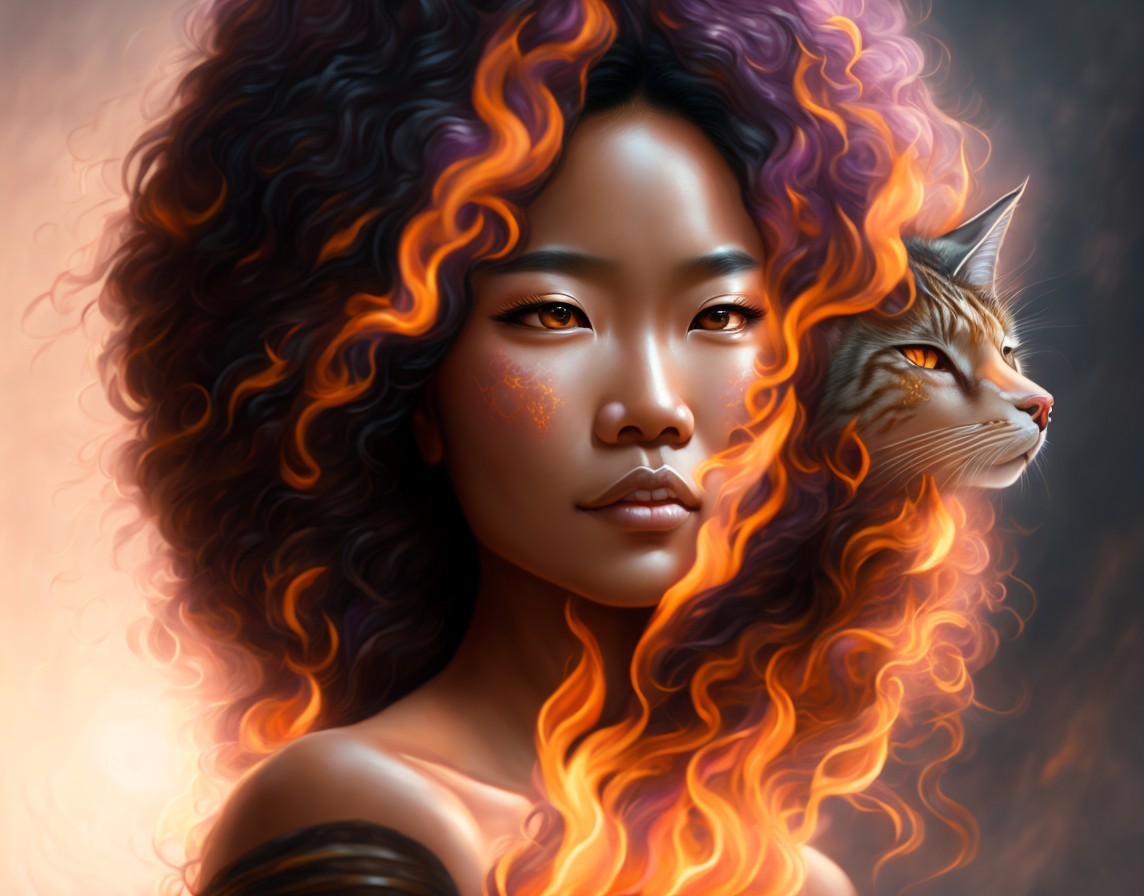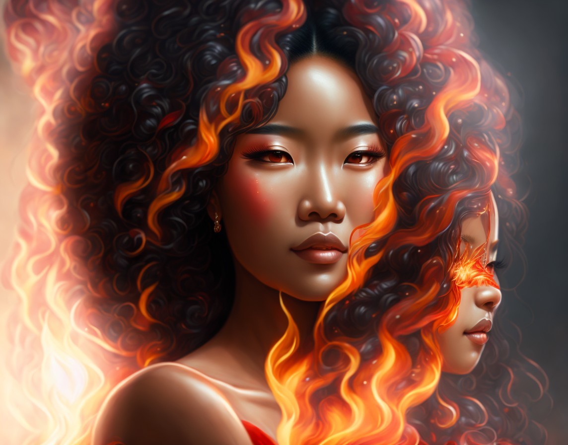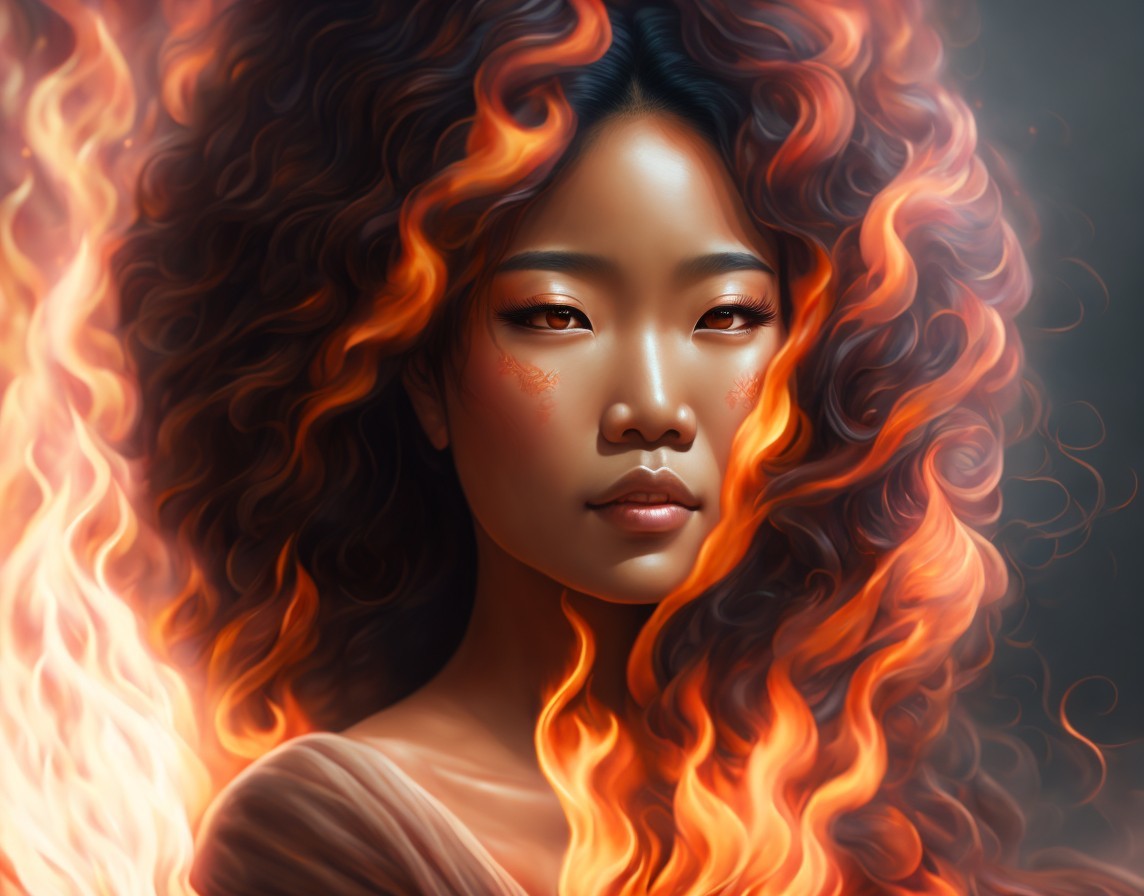A digital portrait of a woman with fiery red hair and glowing, ember-like eyes, exuding a mystical and powerful aura.
