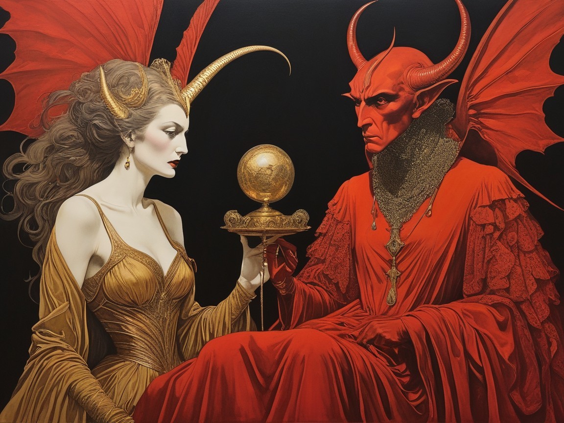 Crimson, brass, ochre and sepia colour palette. The bestest picture ever as if Satan did it.