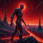A futuristic cyborg stands against a vibrant sunset over a sci-fi cityscape, showcasing intricate circuitry and glowing red accents, embodying a blend of technology and artistry.