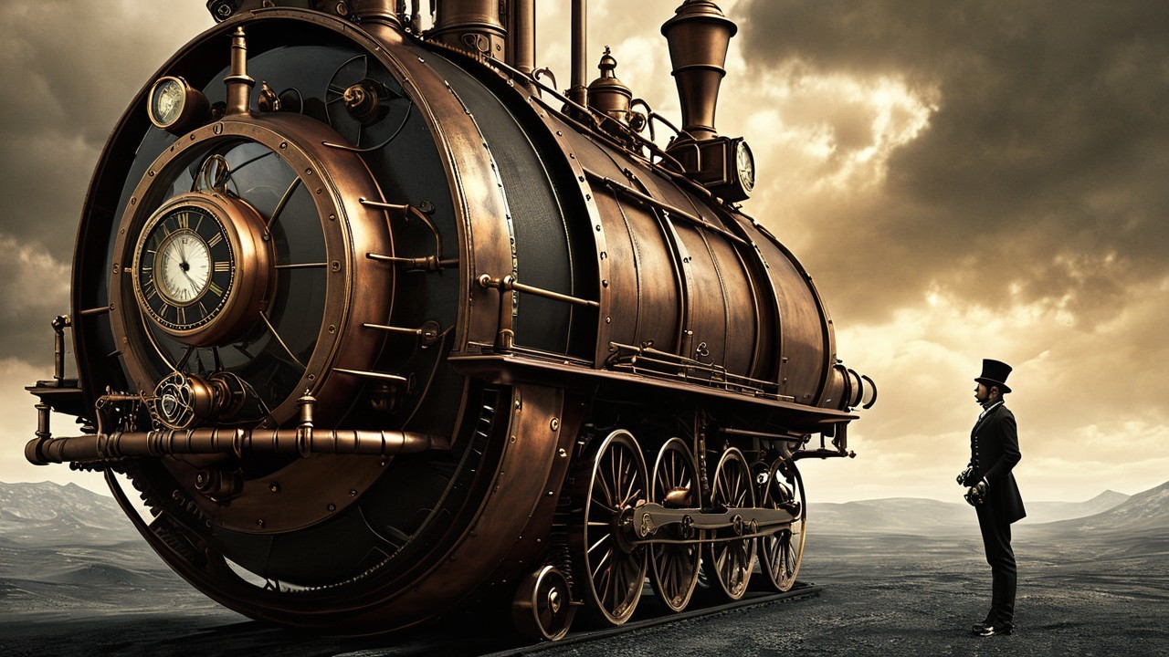 A detailed, eye-level, full shot of a steampunk train in a vast, empty landscape under a dramatic cloudy sky. The train has a smooth, cylindrical body made of polished bronze with dark metal accents.